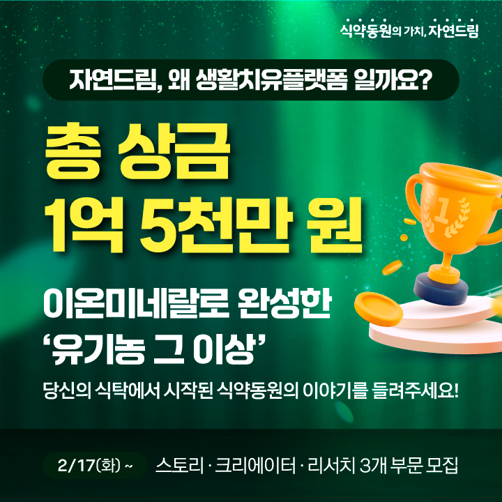 자연드림은 치유에 도움이 되는 좋은 음식, 운동, 휴식을 위한 힐링 생활 플랫폼입니다.