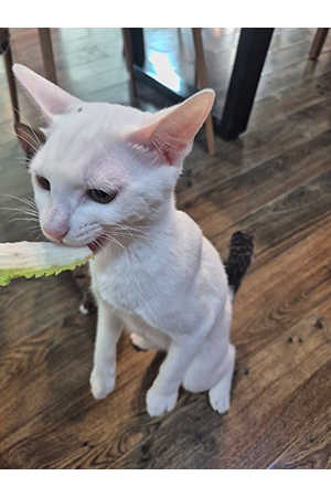 이 특별한 채식 선호 고양이에게 먼저 시식을 시켜봅니다.