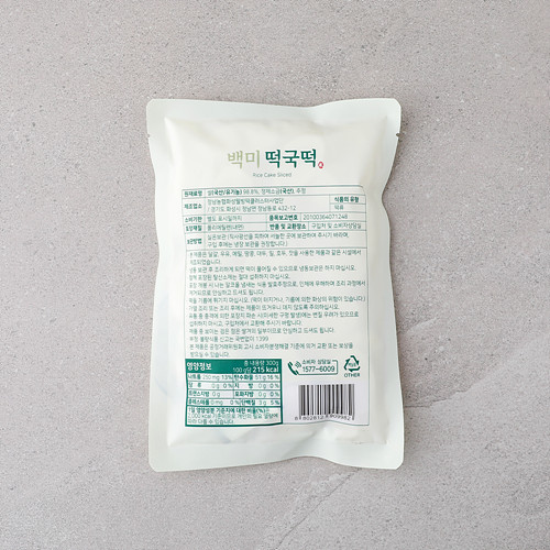 | | | 공급시기 | | 상시공급 | | | 식품유형 | | 떡류 | | | 제조업소 | | 정남농협화성웰빙떡클러스터사업단│경기도 화성시 정남면 정남동로 432-12 | | | 원재료명 | | 쌀(국산/유기농) 98.8%, 정제소금(국산), 주정 | | | 내용량 | | 300g | | | 포장재질 | | 폴리에틸렌(내면) | | | 소비기한 | | 제조일로부터 90일까지 | | | 보관방법 | | 실온보관(1~35℃) | | | 영양정보 | | 총 내용량 500gㅣ100 g당 215kcal 100 g당 함량 ㅣ 1일 영양성분 기준치에 대한 비율 나트륨 250 mg (13 %), 탄수화물 51 g (16 %), 당류 0 g (0 %) , 지방 0.1 g (0 %), 트랜스지방 0 g , 포화지방 0 g (0 %), 콜레스테롤 0 mg (0 %), 단백질 3 g (5 %) 1일 영양성분 기준치에 대한 비율(%)은 2,000kcal 기준이므로 개인의 필요 열량에 따라 다를 수 있습니다. | |