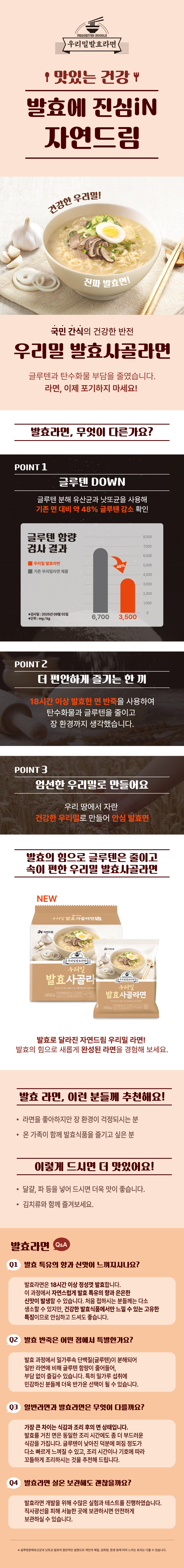 | | | | 물품특징 | | 1. 우리밀로 만든 글루텐을 사용하여 속까지 100% 우리밀입니다. 2. 18시간 이상 발효한 반죽을 사용하였습니다. 3. 중금속 미세플라스틱(45㎛ 기준)불검출 깊은바다소금을 사용했습니다. | | | 이용방법 | | 1. 물 550ml(약 3컵정도)를 끓인 후, 면과 분말스프를 넣고 약 4분 끓입니다. 2. 식성에 따라 달걀, 파 등을 넣어 드시면 더욱 맛이 좋습니다. | | | 생산과정 | | 1. 원료 배합 -> 반죽 -> 발효 -> 면대형성 -> 절출 -> 증숙 -> 접안 -> 유탕조에서 튀겨냄 -> 냉각 -> 면 2. 스프를 면과 함께 포장한다. | | | 기타사항 | | * 이 제품은 알류, 땅콩, 게, 새우, 복숭아, 토마토, 아황산류, 닭고기, 오징어, 조개류를 사용한 제품과 같은 제조시설에서 제조하고 있습니다. * 사골베이스를 사용하여 조리 시 원재료 특유의 향이 느껴질 수 있으나, 이는 품질에는 이상이 없으니 안심하고 섭취하기시 바랍니다. | |