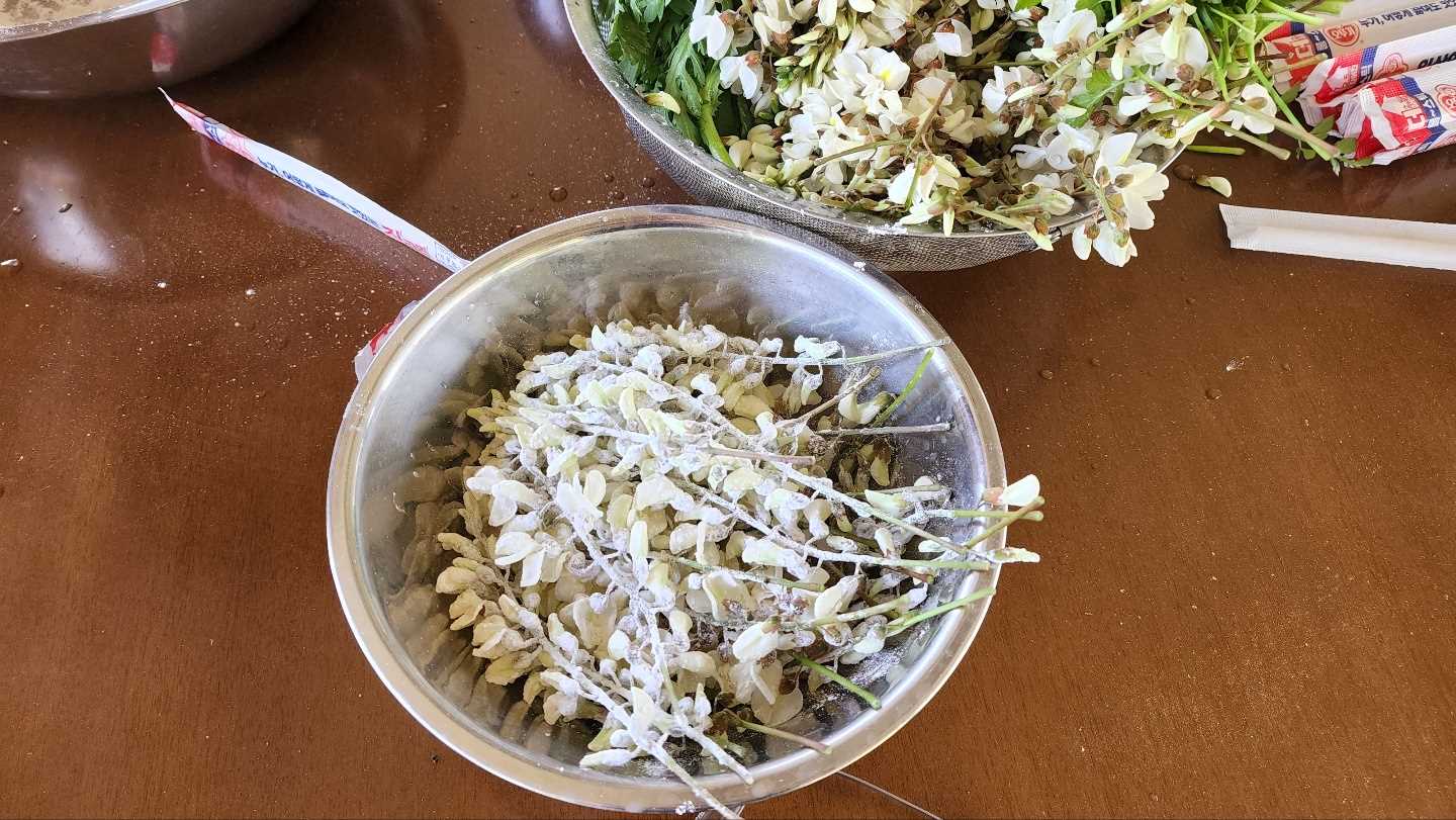 ②미리 손질한 재료의 물기를 제거하여 마른 튀김가루를 고루 묻혀 가볍게 털어줍니다.