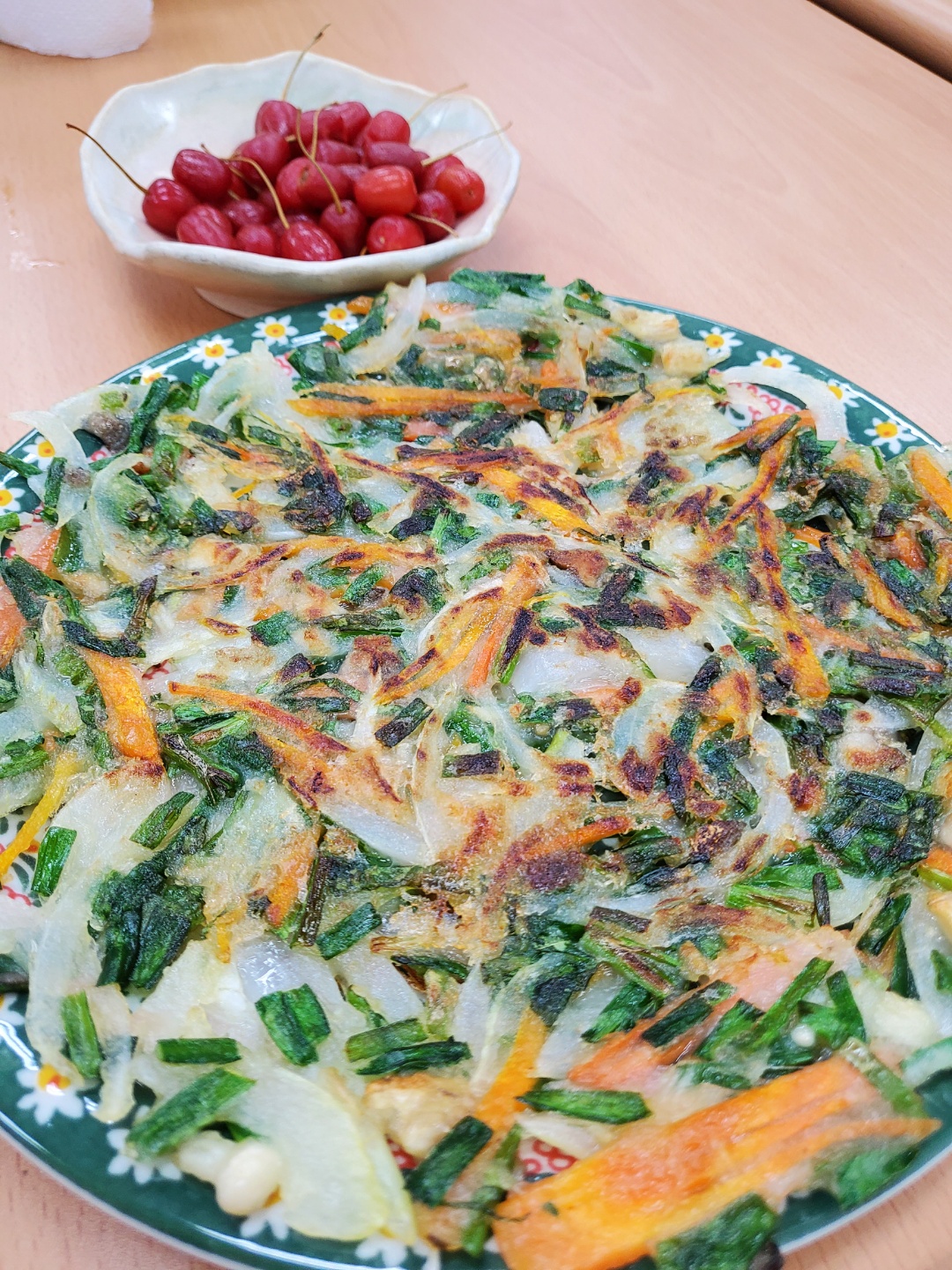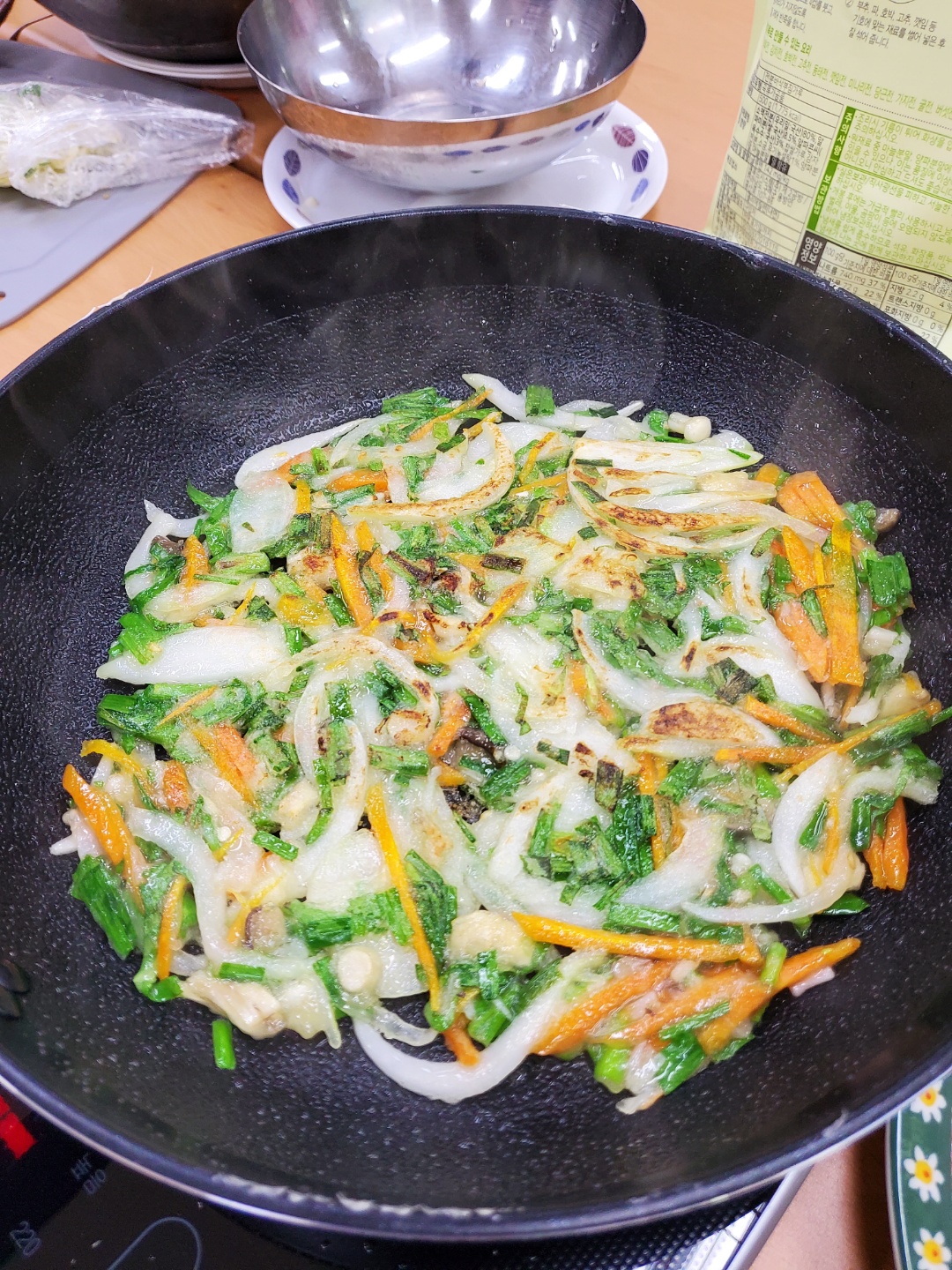 ③가열된 후라이팬에 기름을 두른 후 반죽을 고르게 편 다음 3~4분정도 부칩니다.