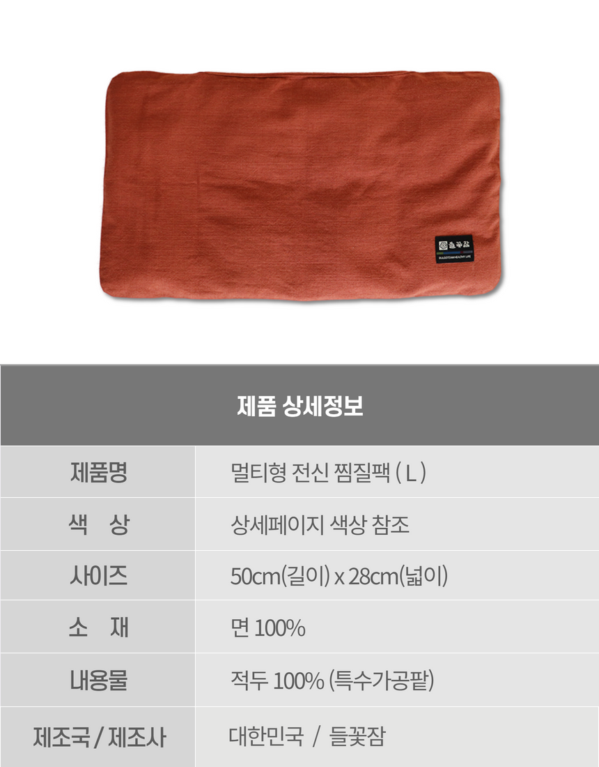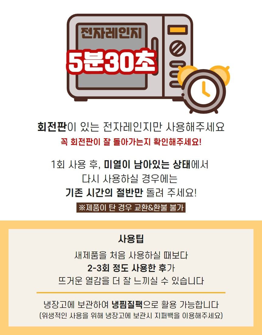 | | | 물품특징 | | 1) 100% 천연소재로 만들어 남녀노소 누구나 사용하실 수 있습니다. 2) 물을 뿌리거나 다른 조작없이 전자렌지에 데워서 사용 가능합니다. 3) 견고하게 만든 제품이라 잘 관리하실 경우 2~3년간 반영구적 사용이 가능합니다. 4) 냉.온찜질이 모두 가능합니다. | | | 이용방법 | | 1) 전자레인지를 사용해 약 5분30초간 데워줍니다. ※깨끗한 접시 위에 올린뒤, 전자레인지 회전이 멈추지 않도록 가열합니다. 2) 1회 사용 후 미열이 남아 있는 상태에서 다시 사용하실 경우 가열시간을 절반으로 줄여주세요 3) 냉찜질팩사용시 지퍼백에 담아 냉동실에 5~10분정도 넣었다 사용하세요 4) 세탁시 커버만 분리하여 세탁해 주세요 | | | 유의사항 | | 1) 가정용 전자레인지(700W)를 사용해주시기 바라며, 회전판이 없는 오븐렌지는 사용불가입니다.(제품이 탈 수있음) 2) 새제품을 처음 사용할 때는 조금 덜 뜨겁습니다. 3~4회 사용 후 뜨겁게 느껴집니다. 3) 사용 상 부주의로 인한 반품 또는 보상은 어려우니 주의해 주시기 바랍니다. | |