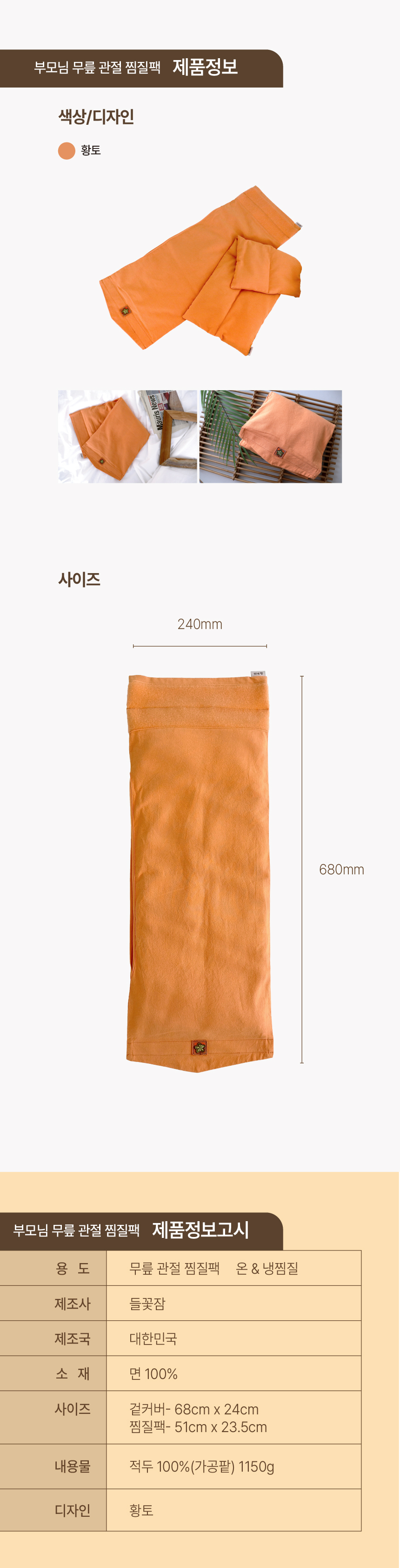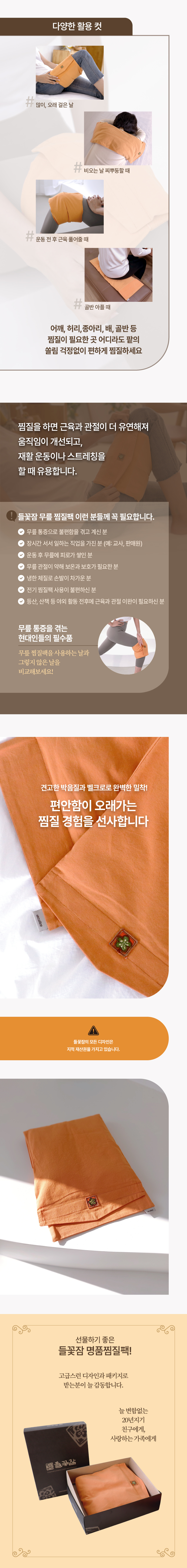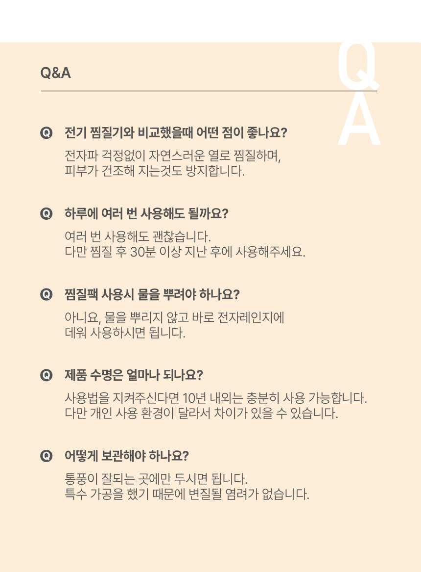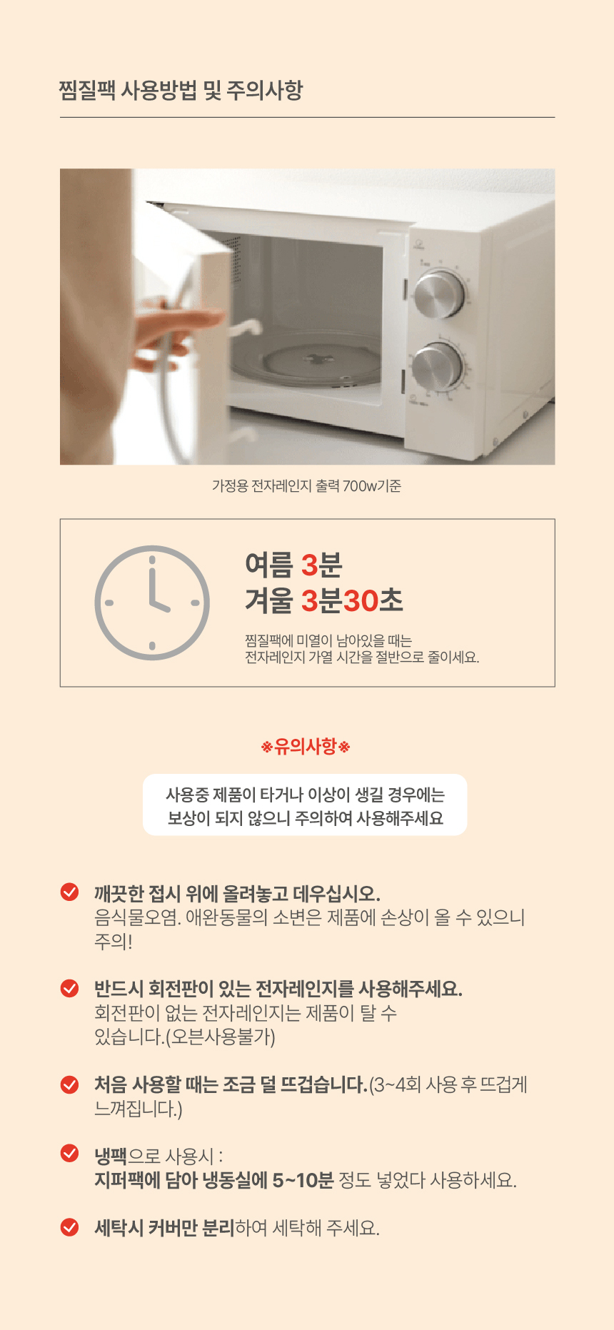 | | | 물품특징 | | 1) 100% 천연소재로 만들어 남녀노소 누구나 사용하실 수 있습니다. 2) 물을 뿌리거나 다른 조작없이 전자렌지에 데워서 사용 가능합니다. 3) 견고하게 만든 제품이라 잘 관리하실 경우 2~3년간 반영구적 사용이 가능합니다. 4) 냉.온찜질이 모두 가능합니다. | | | 이용방법 | | 1) 전자레인지를 사용해 약 3분간 데워줍니다. ※깨끗한 접시 위에 올린뒤, 전자레인지 회전이 멈추지 않도록 가열합니다. 2) 1회 사용 후 미열이 남아 있는 상태에서 다시 사용하실 경우 가열시간을 절반으로 줄여주세요 3) 냉찜질팩사용시 지퍼백에 담아 냉동실에 5~10분정도 넣었다 사용하세요 4) 세탁시 커버만 분리하여 세탁해 주세요 | | | 유의사항 | | 1) 가정용 전자레인지(700W)를 사용해주시기 바라며, 회전판이 없는 오븐렌지는 사용불가입니다.(제품이 탈 수있음) 2) 새제품을 처음 사용할 때는 조금 덜 뜨겁습니다. 3~4회 사용 후 뜨겁게 느껴집니다. 3) 사용 상 부주의로 인한 반품 또는 보상은 어려우니 주의해 주시기 바랍니다. | |