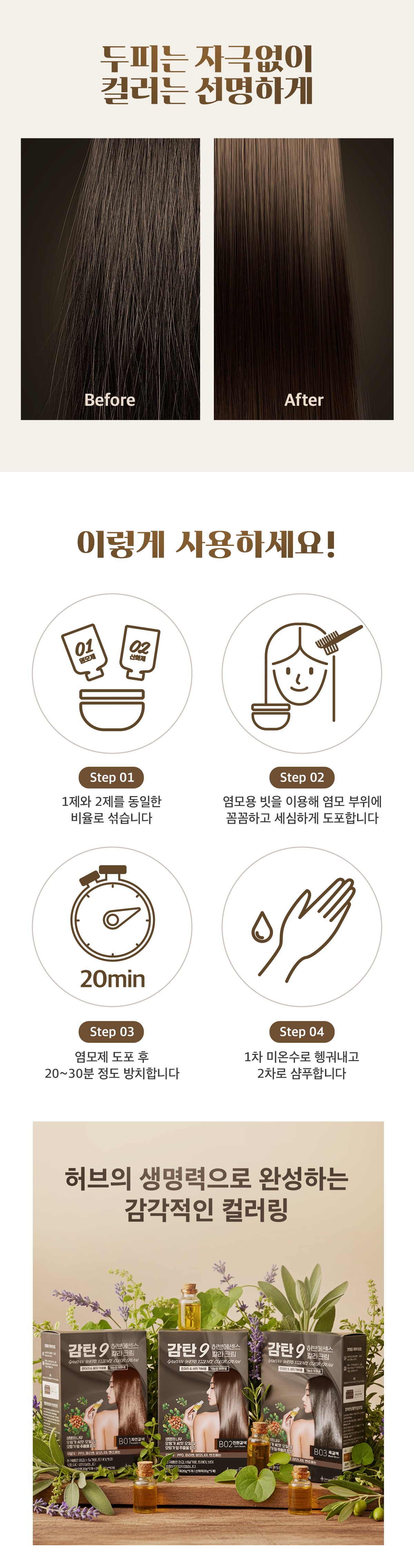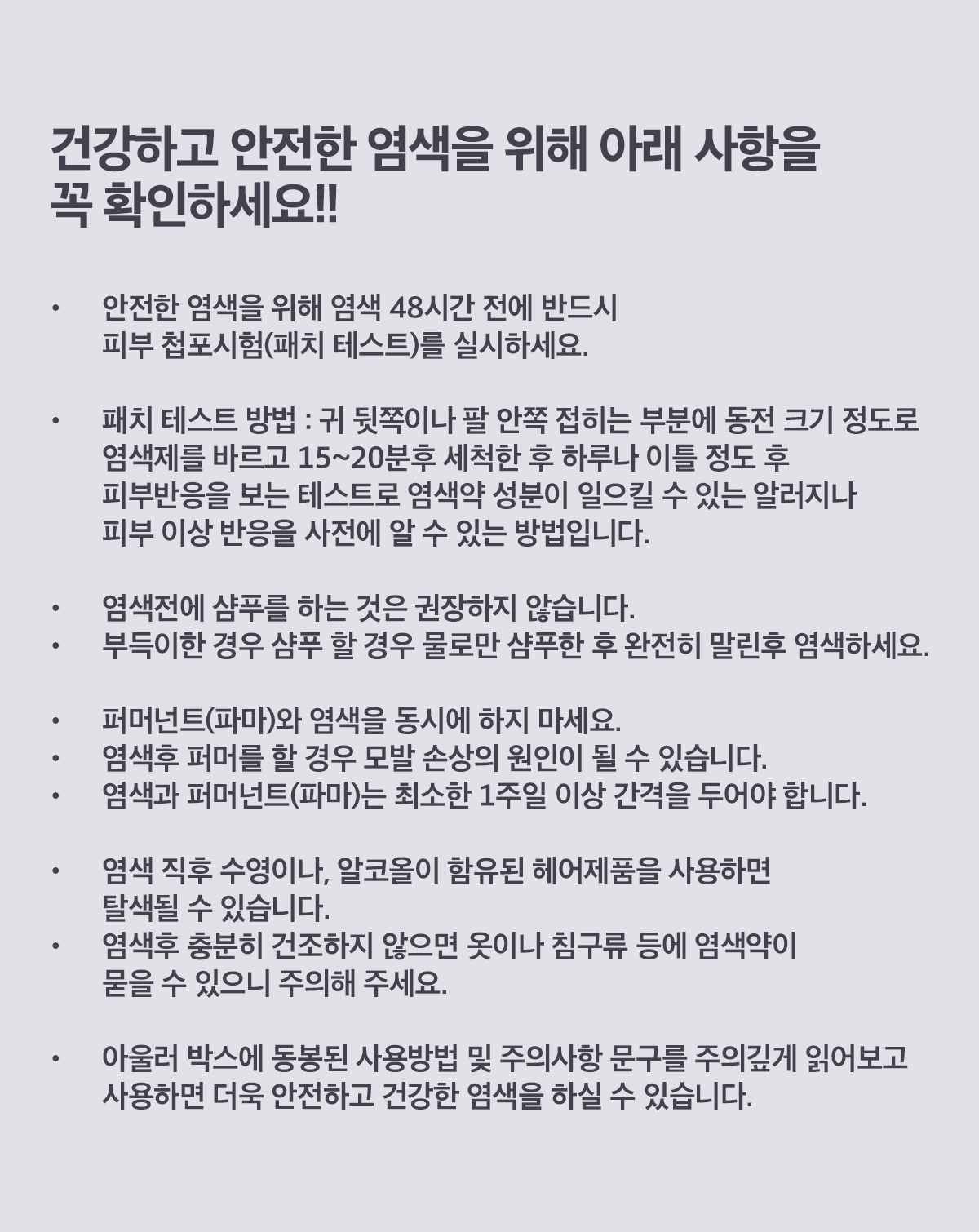 | | | 물품특징 | | ◼ 사용상 주의사항 안전한 염색을 위해 염색 48시간 전에 반드시 피부 첩포 시험(패치 테스트)을 실시하십시오. 사용 전 반드시 상품에 동봉된 사용설명서를 읽어보시기 바랍니다. ◼ 참고사항 유해한 물질을 최소화 한 상품으로 일반 염모제를 사용하셨던 경우 지속시간이 짧을 수 있습니다. 2제 산화제는 과산화수소수로 인해 보관조건에 따라 부풀어 오를 수 있으나 기능면에서 정상 사용하셔도 됩니다. | | | 이용방법 | | ◼ 사용방법 (사용설명서 필독) 1) 모발을 미온수로 깨끗이 씻어낸 후 건조합니다. 2) 비닐장갑을 착용하고 제1염모제와 제2산화제를 혼합합니다. 3) 모발에 골고루 묻히고 뒤쪽부터 앞쪽으로 골고루 펴 바릅니다. 4) 염모제 도포가 완료되고 약 20분 후 미온수로 헹궈서 씻어 냅니다. | | | 생산과정 | | 해당없음 | |