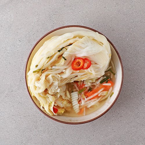 절임배추[배추(국산) 98%, 소금(국산) 2%] 46%, 정제수, 무(국산), 마늘(국산), 쪽파(국산), 대파(국산), 미나리(국산), 소금(국산) 0.6%, 홍고추(국산), 양파(국산), 당근(국산), 배(국산), 사과(국산), 생강(국산), 다시마육수(다시마/국산), 멸치액젓(멸치/국산) 0.4%, 밤(국산)