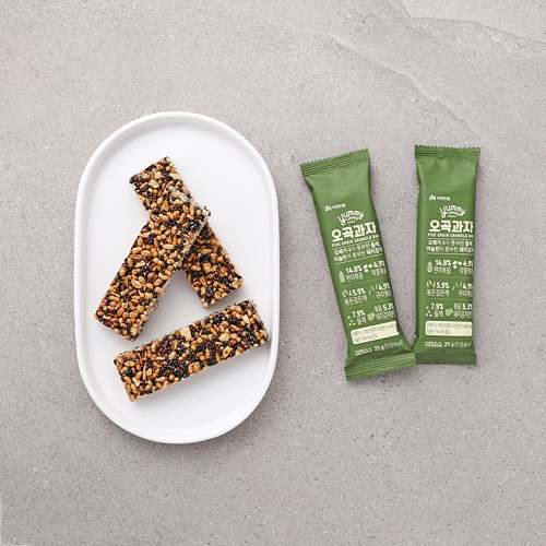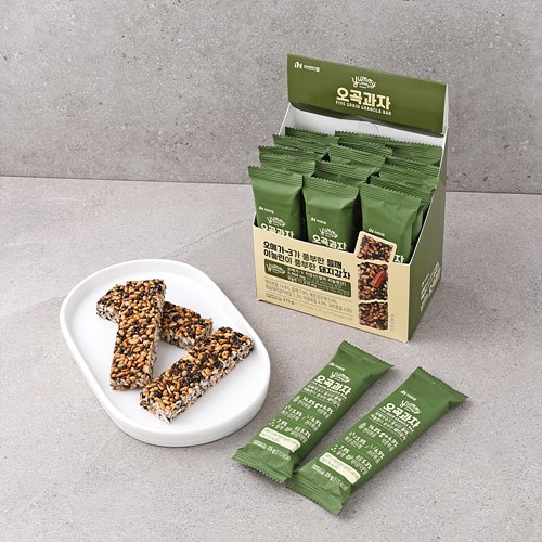 | | | 상품특징 | | 1. 우리땅에서 건강하게 자란 5가지 곡물(현미, 들깨, 검은깨, 검은콩,귀리)을 사용하였습니다. 2. 통들깨의 오메가-3와 볶음돼지감자분말의 이눌린을 담은 곡물바 입니다. 오곡과자 1개(25g)에는 오메가-3(알파 리놀렌산)이 460mg, 이눌린(식이섬유)가 794mg 함유되어 있습니다. | | | 생산과정 | | 1. 당액을 만듭니다. 2. 당액에 다섯가지 곡물과 견과류를 넣은 후 혼합합니다. 3. 혼합된 반죽을 틀에 넣고 일정한 크기로 잘라냅니다. 4. 일정한 크기의 곡물바를 건조한 후 밀봉포장합니다. 5. 개별 포장한 오곡과자를 15개입 종이박스 포장합니다. | | | 이용방법 | | 바 형태로 개별 포장되어 있어 휴대가 용이하며, 간식 또는 식사대용으로 이용하시면 좋습니다. | | | 기타사항 | | 본 제품은 쇠고기, 돼지고기, 달걀, 우유, 땅콩, 밀, 대두, 잣, 호두, 새우, 오징어, 토마토, 아황산류를 사용한 상품과 같은 제조시설에서 제조하고 있습니다 .