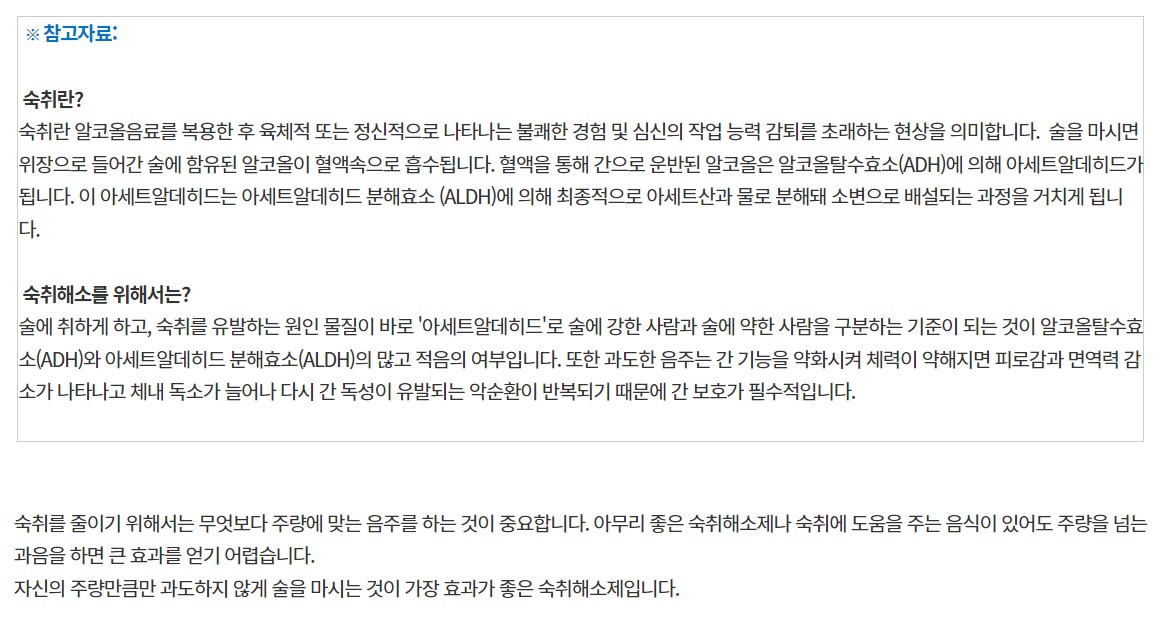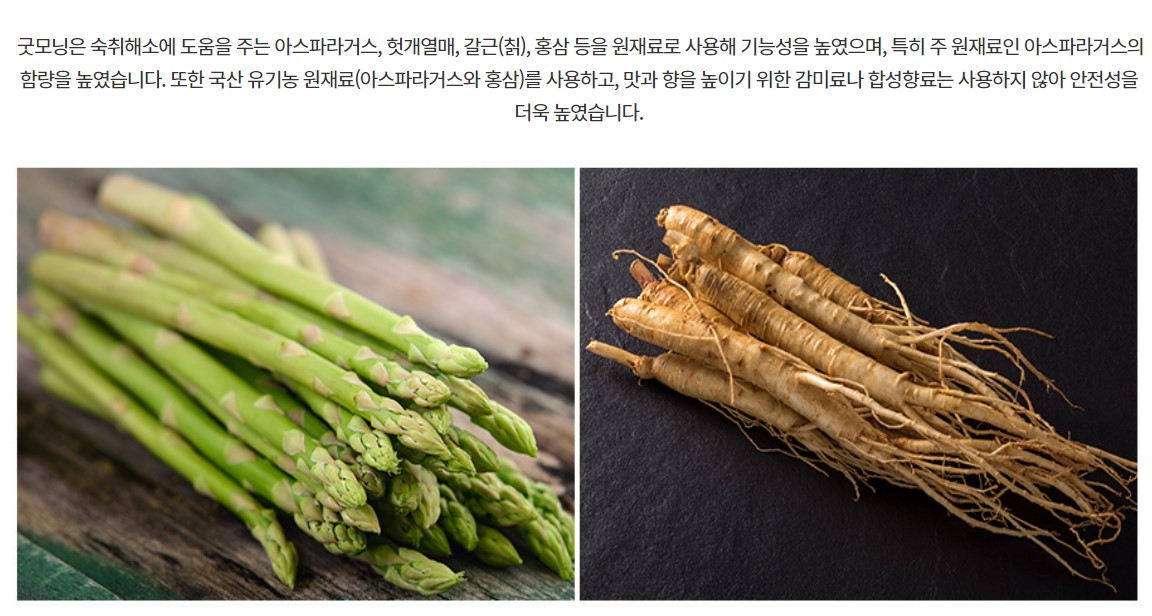 | | | 물품특징 | | *유기농아스파라거스 및 헛개열매추출액과 간 건강에 도움을 주는 건강기능식품 원료인 밀크씨슬추출물분말과 유기농홍삼추출액을 사용하여 숙취해소의 효과를 더하였습니다. *합성향료나 감미료는 사용하지 않았습니다. | | | 생산과정 | | 추출 -교반 - 살균- 병주입 - 수축포장 - 박스포장 | | | 이용방법 | | 음주 전, 후 1병씩 드시면 좋습니다. | | | 기타사항 | | *고유성분으로 인해 침전물이 생길 수 있으나 안심하고 흔들어 드시면 됩니다. *시원하게 드시면 더욱 좋습니다. *과도한 음주는 건강을 해칩니다. *본 제품은 우유, 대두를 사용한 제품과 같은 제조시설에서 제조합니다. | |