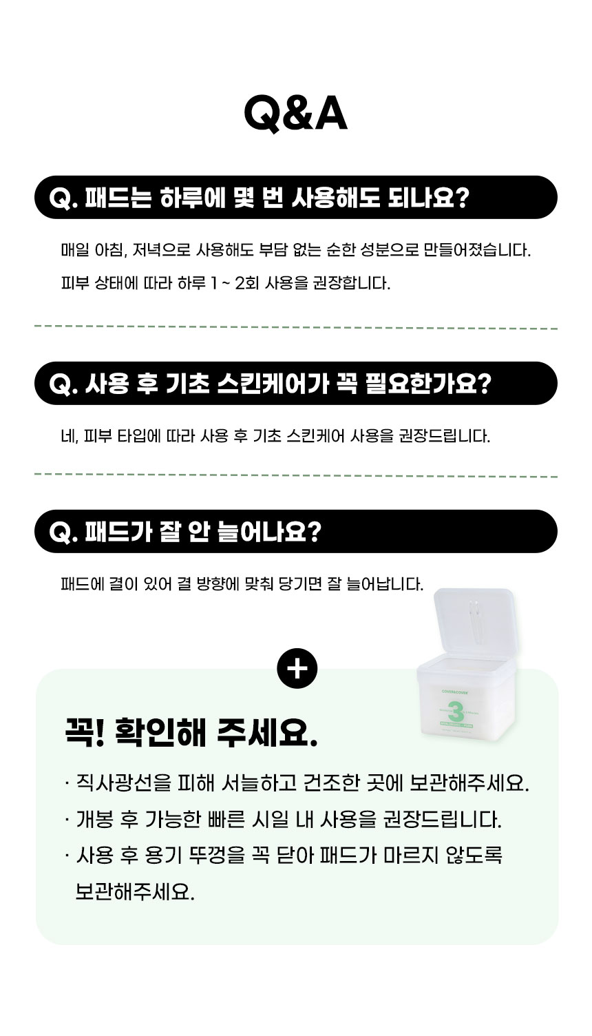 | | | 물품특징 | | 반으로 컷팅하여 사용이 가능하도록 만들었습니다. 3중(솜털 패드층 / 에센스 보유층 / 솜펄패드충) 엠보싱 비건패드 사용 고보습 3분 패드팩 | | | 이용방법 | | 집중 케어가 필요한 볼, 이마, 턱 등에 3~10분 정도 붙인 후 떼어 내세요 | | | 이용 팁 | | 머리 말릴 때 패드 팩을 붙이면 피부 보습과 진정에 도움이 됩니다. | |