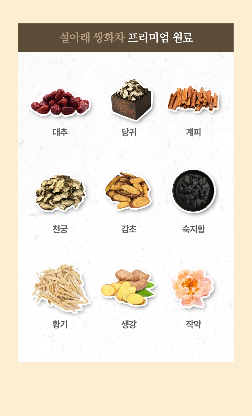 원부재료정제수, 작약(국산), 숙지황(국산), 천궁(국산), 당귀(국산), 감초(중국산), 대추(국산), 계피(베트남산), 생강(국산), 프락토올리고당
