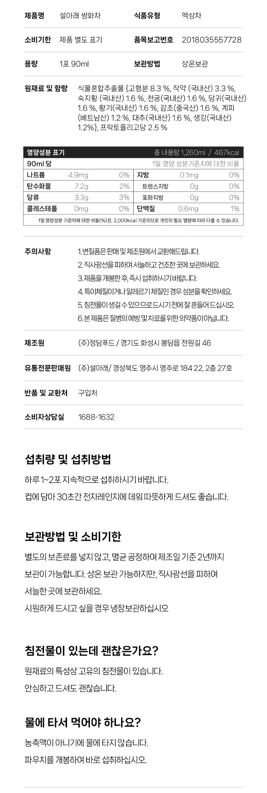 2. 침전물이 생길 수 있으나 제품의 원재료 이므로 드시기 전 잘 흔들어 드시기 바랍니다.