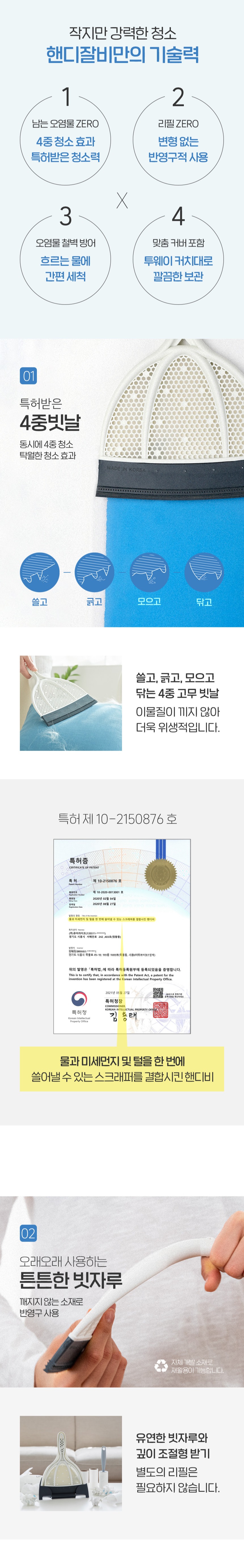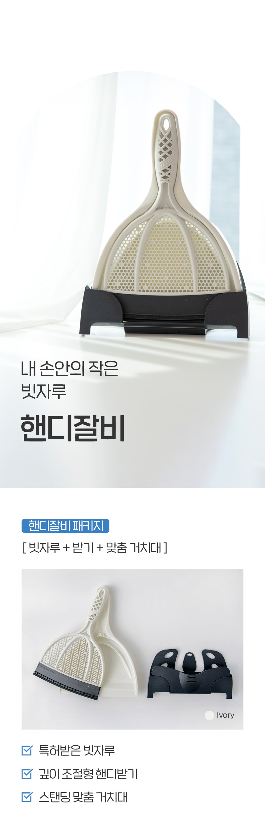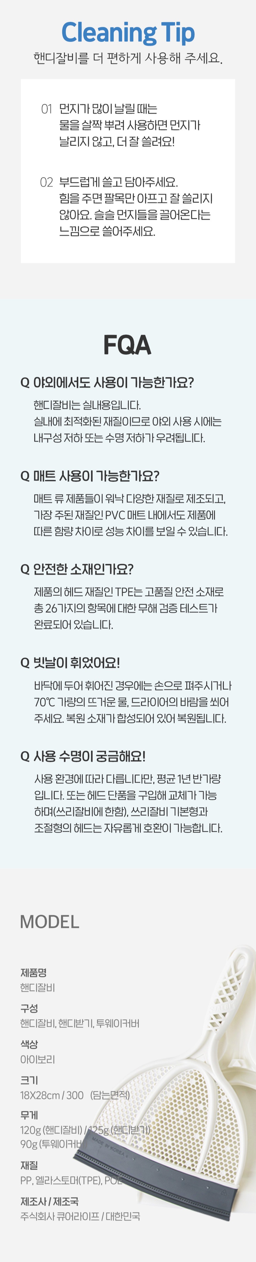 | | | 공급시기 | | 기획공급 | | | 생산지 | | (주)큐어라이프 | | | 재질 | | PP, 엘라스토머(TPE), 알루미늄 | | | 규격 | | 180mm x 280mm | | | 구성 | | 핸디잘비 본체, 핸디받기, 투웨이커버 | | | 소비기한 | | 해당없음 | | | 주의사 | | 1. 빗자루를 바닥에 세워 보관하면 헤드의 날이 휘어질 수 있으니 동봉된 행거에 걸어서 보관하세요 2. 내구성 유지를 위해 직사광선 아래 또는 열원 근처에는 보관하지 말아주세요 3. 흠집이 나기 쉬운 재질을 쓸어낼 때는 반드시 모래나 흙 등의 이물질을 제거한 후 사용 4. 본 제품은 실내용 제품으로 야외에서 사용 시 제품이 손상될 수 있습니다. 5. 본래 용도 외 다른 용도로 사용하지 마십시오 | |
