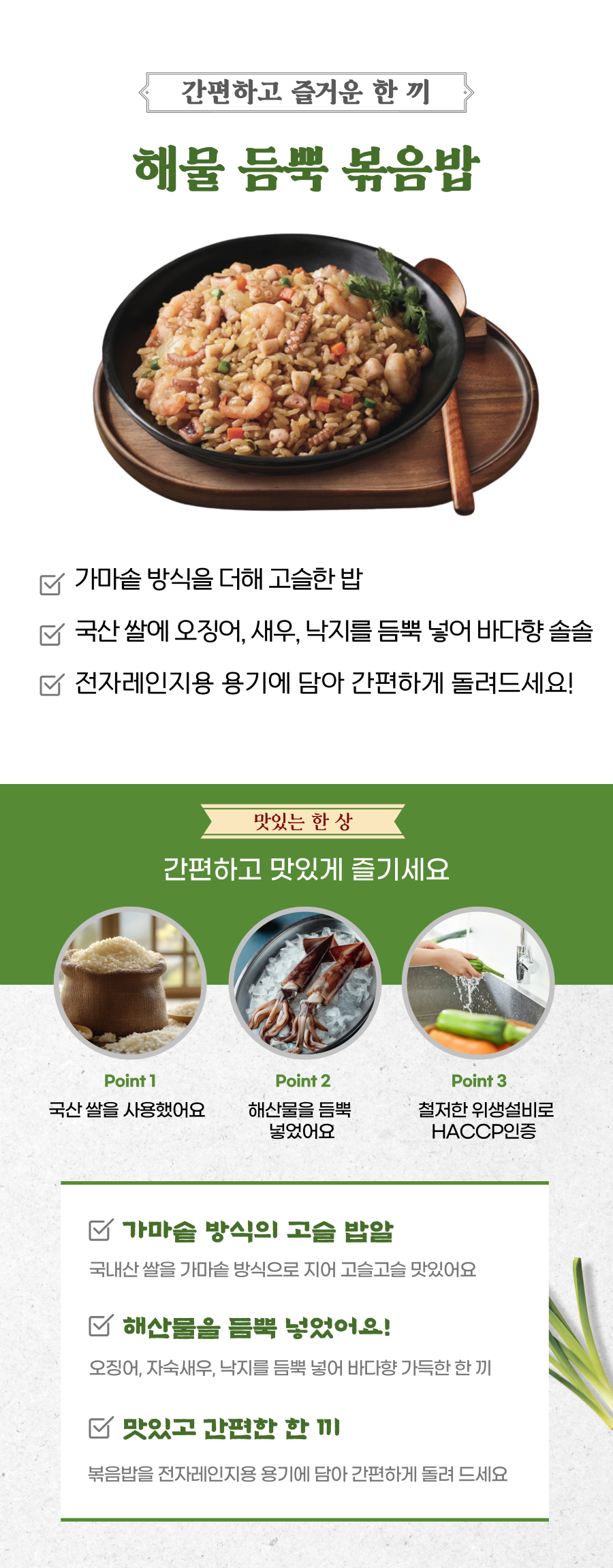 | | | 물품특징 | | 국산 쌀을 가마솥 방식으로 고슬고슬하게 지었습니다. 오징어, 낙지, 새우를 듬뿍 넣어 맛있게 만들었습니다. 전자레인지용 용기에 담아 간편하게 즐길 수 있습니다. | | | 생산과정 | | 원료 세척 - 선별 - 계량 - 볶음 - 취사 - 계량된 재료와 밥 혼합 - 가열 - 동결 - 포장 | | | 이용방법 | | [전자레인지] ①냉동상태의 볶음밥을 전자레인지 전용 용기에 담아 랩 등을 씌워주세요. ②전자레인지(700W기준)에 약 4분간 조리한 후 맛있게 드세요. *각 가정의 전자레인지 성능에 따라 조리시간이 달라질 수 있습니다. *조리 후 차가운 경우, 조금 더 데워주세요. [프라이팬] ①중불에 프라이팬을 가열합니다. ②달궈진 프라이팬에 냉동상태의 볶음밥을 넣어주세요. ③주걱 또는 뒤집개로 약 3분간 볶아 주신 후 맛있게 드세요. *기호에 따라 다양한 재료를 추가해 드시면 더욱 좋습니다. | | | 기타사항 | | 이미 냉동된바 있으니 해동 후 재냉동시키지 마시기 바랍니다. 남은 제품은 해동되지 않도록 즉시 냉동보관 하십시오. 보관방법 미준수 시에는 변질 등의 우려가 있으니 보관조건을 반드시 지켜주시기 바랍니다. 조리시 뜨거운 기름이나 열에 주의하시고, 조리기구가 과열될 수 있으니 자리를 뜨지 마시고 조리과정을 확인하시기 바랍니다. 제품 특성상 새우껍질이 혼입될 수 있으니 취식중 주의하십시오. 이 제품은 알류, 우유, 메밀, 땅콩, 고등어, 게, 돼지고기, 복숭아, 토마토, 아황산류, 호두, 닭고기, 쇠고기, 잣, 조개류(전복, 홍합 포함)를 사용한 제품과 같은 제조시설에서 제조하고 있습니다. | |