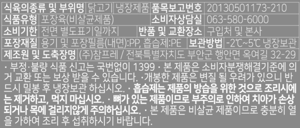 | | | 공급시기 | | 기획상품 | | | 제조원 및 도축장명 | | (주)참프레 / 전북 부안군 행안면 옥여길 32-29 | | | | 중량 | | 1kg | | | 원료명 및 함량 | | 무항생제 동물복지 인증 닭고기 100%(국내산) | | | 포장재질 | | 용기 및 포장필름(내면): PP / 흡습제: PE | | | 소비기한 | | 제조일로부터 7일까지 | | | 보관방법 | | -2~5℃ 냉장보관 | |