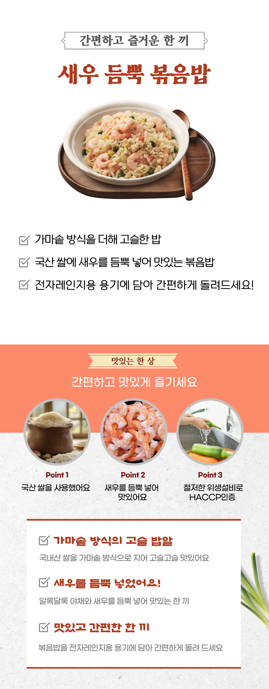 | | | 물품특징 | | 국산 쌀을 가마솥 방식으로 고슬고슬하게 지었습니다. 새우를 듬뿍 넣어 맛있게 만들었습니다. 전자레인지용 용기에 담아 간편하게 즐길 수 있습니다. | | | 생산과정 | | 원료 세척 - 선별 - 계량 - 볶음 - 취사 - 계량된 재료와 밥 혼합 - 가열 - 동결 - 포장 | | | 이용방법 | | [전자레인지] ①냉동상태의 볶음밥을 전자레인지 전용 용기에 담아 랩 등을 씌워주세요. ②전자레인지(700W기준)에 약 4분간 조리한 후 맛있게 드세요. *각 가정의 전자레인지 성능에 따라 조리시간이 달라질 수 있습니다. *조리 후 차가운 경우, 조금 더 데워주세요. [프라이팬] ①중불에 프라이팬을 가열합니다. ②달궈진 프라이팬에 냉동상태의 볶음밥을 넣어주세요. ③주걱 또는 뒤집개로 약 3분간 볶아 주신 후 맛있게 드세요. *기호에 따라 다양한 재료를 추가해 드시면 더욱 좋습니다. | | | 기타사항 | | 이미 냉동된바 있으니 해동 후 재냉동시키지 마시기 바랍니다 . 남은 제품은 해동되지 않도록 즉시 냉동보관 하십시오. 보관방법 미준수 시에는 변질 등의 우려가 있으니 보관조건을 반드시 지켜주시기 바랍니다. 조리시 뜨거운 기름이나 열에 주의하시고, 조리기구가 과열될 수 있으니 자리를 뜨지 마시고 조리과정을 확인하시기 바랍니다. 제품 특성상 새우껍질이 혼입될 수 있으니 취식중 주의하십시오. 이 제품은 알류, 메밀, 땅콩, 고등어, 돼지고기, 복숭아, 토마토, 아황산류, 호두, 닭고기, 오징어, 잣, 조개류(굴, 전복, 홍합 포함)를 사용한 제품과 같은 제조시설에서 제조하고 있습니다. | |