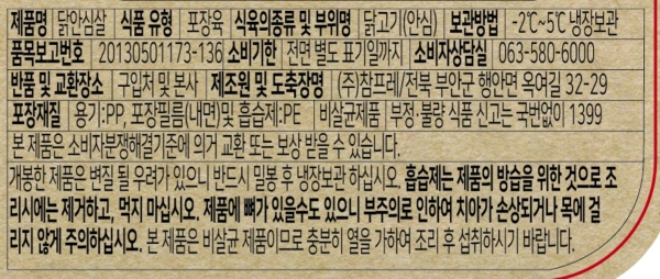 | | | 공급시기 | | 기획공급 | | | 제조원 및 도축장명 | | (주)참프레 / 전북 부안군 행안면 옥여길 32-29 | | | | 중량설명 | | 300g | | | 원재료명 및 함량 | | 무항생제 동물복지 인증 닭고기 100%(국내산) | | | 포장재 | | 용기: PP, 포장필름(내면) 및 흡습제 : PE | | | 소비기한 | | 제조일로부터 9일까지 | | | 보관방법 | | -2~5℃ 냉장보관 | |