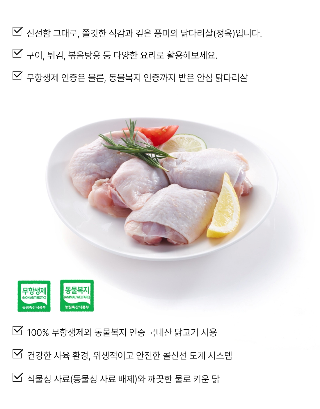 | | | 물품특징 | | 무항생제 동물복지 인증 닭고기를 사용합니다 | | | 이용방법 | | 닭다리살 구이, 볶음탕용, 순살치킨 등 다양한 요리로 즐기세요 | | | 생산과정 | | 중량선별 -> 원료육 상태별 선별 -> 등급판정 -> 가공(백숙,볶음,부분육 등) -> 포장 | | | 주의사항 | | *유통 중 포장용기가 파손되지 않도록 주의하시고 개봉한 제품은 변질될 우려가 있으니 반드시 밀봉 후 냉장보관 하십시오 *흡습제는 제품의 방습을 위한 것으로 조리시에는 제거하고 먹지 마십시오. *뼈가 있을 수 있으니 부주의로 인하여 치아가 손상되거나 목에 걸리지 않게 주의하십시오. *본 제품은 비살균 제품이므로 충분히 열을 가하여 조리 후 섭취하시기 바랍니다 | |