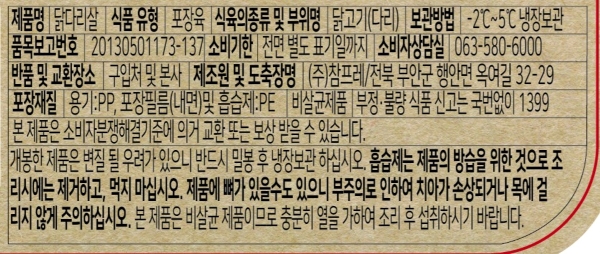 | | | 공급시기 | | 기회공급 | | | 제조원 및 도축장명 | | (주)참프레 / 전북 부안군 행안면 옥여길 32-29 | | | | 중량설명 | | 300g | | | 원재료명 및 함량 | | 무항생제 동물복지 인증 닭고기 100%(국내산) | | | 포장재 | | 용기: PP, 포장필름(내면) 및 흡습제 : PE | | | 소비기한 | | 제조일로부터 9일까지 | | | 보관방법 | | -2~5℃ 냉장보관 | |