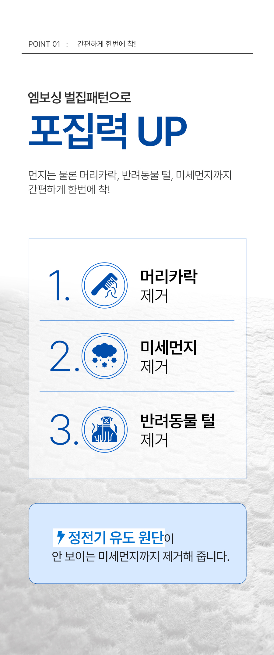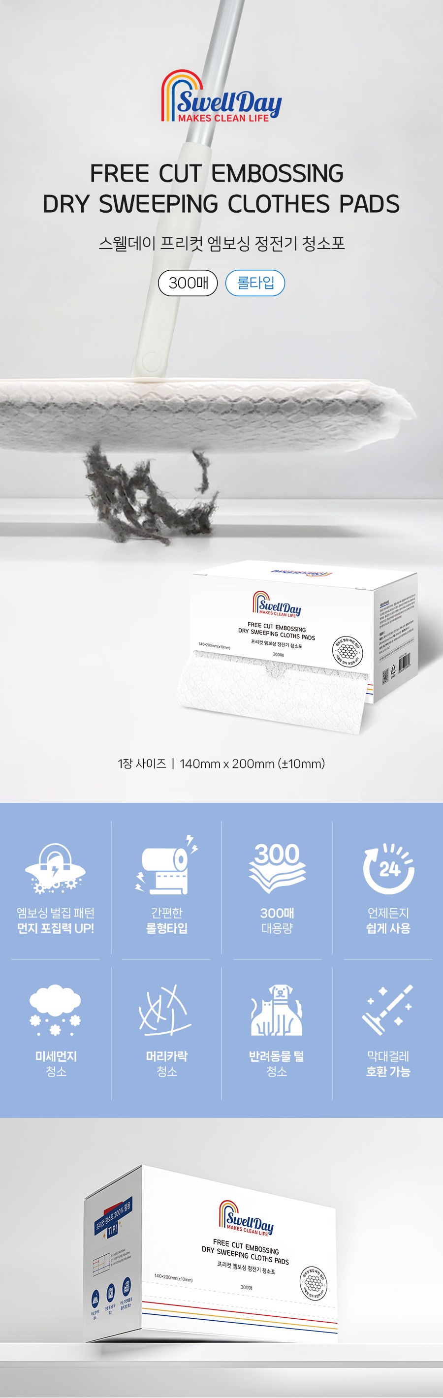 | | | 물품특징 | | 1. 엠보싱 벌집 패턴 원단으로 이물질과 먼지 드의 포집력이 탁월합니다. 2. 자유럽게 다양한 사이즈로 컷팅이 가능합니다 3. 와이드형, 표준형 막대걸레 호환이 가능합니다 4. 양면 사용 가능합니다. 5. 롤형 타입으로 보관 및 사용이 용이합니다 | | | 이용방법 | | 용도에 맞게 절취선을 따라 청소포를 뜯어 사용합니다. | | | 품질보증기준 | | 본 제품은 공정거래위원회가 고시한 소비자 분쟁해결 기준에 의거 보상 또는 교환을 받을 수 있습니다 | |