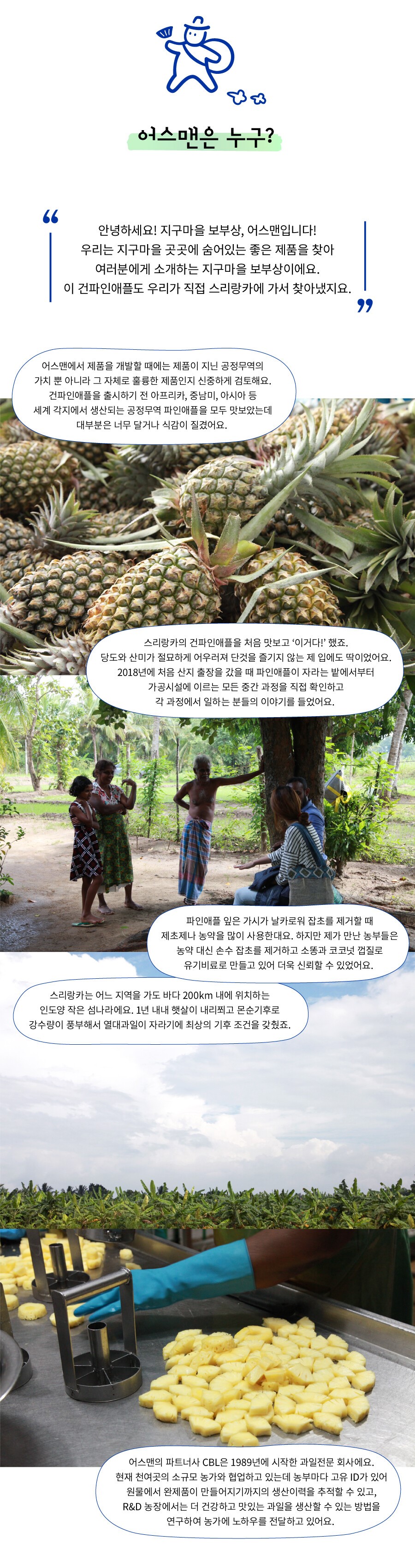 | | | 물품특징 | | ■ 당도와 산미가 절묘하게 어우러진 스리랑카 건파인애플 사시사철 과일이 열리는 인도양의 비옥한 땅, 스리랑카에서 자랍니다. 인도양의 뜨거운 햇살과 몬순기후의 영향으로 어떤 첨가물을 넣지 않아도 맛과 영양이 풍부한 100% 파인애플 입니다. 15g 한봉지의 건파인애플에는 349g 파인애플 생과가 사용되었습니다. 공정무역 건파인애플 판매를 통해 지급되는 공정무역 프리미엄은 생산자들에게 농기구, 잡초제거기를 구입하고 수로를 개선하는 등 더 나은 생산환경을 위해 사용됩니다. 또한 해당 생산지는 마을의 공동체 기금을 마련하여 아이들에게 장학금을 지급합니다. | | | 이용방법 | | 적당량을 간식으로 섭취하시거나 요거트 또는 베이킹 등에 건과일로 함께 활용해보세요. | | | 생산과정 | | 수확→검수→세척→건조(1차햇볕건조)→검수→이동→세척→건조(2차기계건조)→수분율확인→검수→포장→수입통관→소분포장 | | | 기타사항 | | 일체의 첨가물과 당절임처리 없이 100% 생파인애플로만 가공된 제품으로 농산물 특성상 씨, 꼭지, 가지 등이 나올 수 있으니 제거 후 드십시오. | |