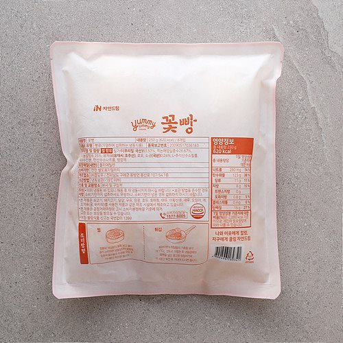 | | | 공급시기 | | 상시공급 | | | 식품유형 | | 빵류 [가열하여 섭취하는 냉동식품] | | | 생산지 | | (주)자연드림치유식품 만두앤탕공방 전라남도 구례군 용방면 용산로 107-54 | | | 원부재료 | | 밀가루(우리밀:국산), 유기농설탕8.6%, 유채유(유채씨:호주산), 효모, 소금(국산), L-주석산수소칼륨, 옥수수전분, 탄산수소나트륨, 팽창제 밀 함유 | | | 중량설명 | | 250 g (8개입) | | | 포장재질 | | 폴리에틸렌 | | | 소비기한 | | 전면 별도표기일까지(제조일로부터 12개월) | | | 보관방법 | | 냉동보관(-18℃이하) / 이미 냉동된 바 있으니 해동 후 재 냉동시키지 마시길 바랍니다. | | | 영양정보표시 | |