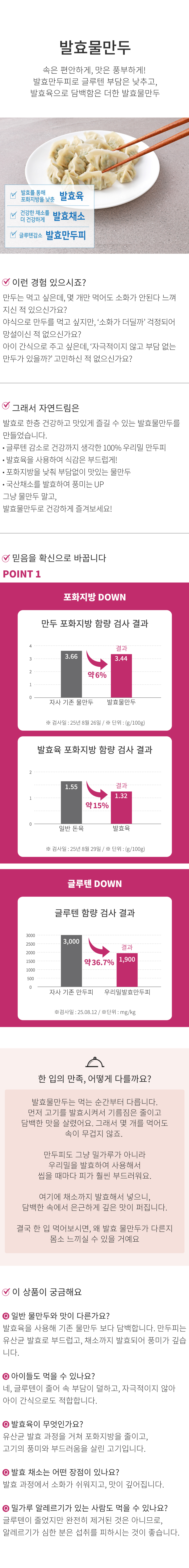 | | | 공급시기 | | 상시공급 | | | 식품유형 | | 만두 [가열하여 섭취하는 냉동식품] | | | 제조업소 | | (주)자연드림치유식품 만두앤탕공방 전라남도 구례군 용방면 용산로 107-54 | | | 원부재료 | | 밀가루(우리밀:국산), 발효담백살2{돼지고기(국산), 소금(국산), 유산균1, 유산균2}, 발효지방2{돼지고기(국산), 소금(국산), 유산균1, 유산균2}, 부추(국산), 대파(국산), 두부(대두:국산), 양배추(국산), 양파(국산), 마늘(국산), 감자전분, 글루텐(우리밀:국산), 복합조미식품, 양조간장, 난백분, 유기농설탕0.4%, 소금(국산), 참기름, 감미유, 생강분말, 흑후추분말, 유산균1, 유산균2, 효모, 푸마르산제일철, 엽산 [ 밀, 돼지고기, 우유, 대두, 달걀 함유 ] | | | 중량설명 | | 1020 g | | | 포장재질 | | 폴리에틸렌(내면) | | | 소비기한 | | 전면 표기일까지(제조일로부터 12개월) | | | 보관방법 | | 냉동보관 / 이미 냉동된 바 있으니 해동 후 재냉동시키지 마시길 바랍니다. | | | 영양정보표시 | |