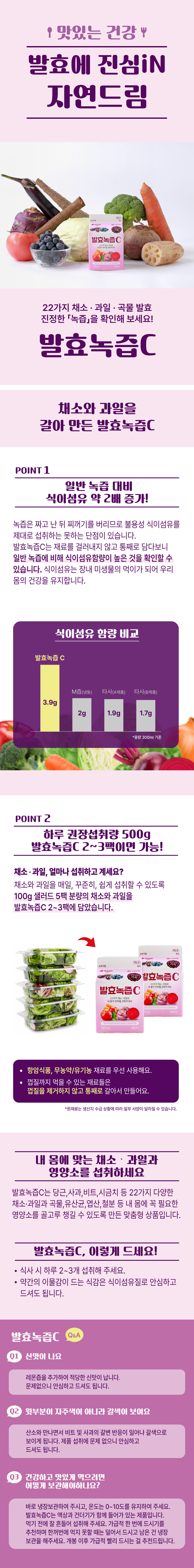 | | | 물품특징 | | 1. 엄선된 22가지 채소,과일과 곡물, 해조, 유산균, 철분, 엽산 등의 재료로 몸에 꼭 필요한 영양소를 골고루 챙길 수 있도록 만든 맞춤형 상품입니다. 2. 하루 필요한 채소,과일 권장섭취량(생채) 500g을 2팩~3팩에 담았습니다. 3. 채소,과일을 갈아 식이섬유함량이 높습니다. | | | 이용방법 | | 식사 시, 하루 2~3개 섭취 해주세요 | | | 생산과정 | | 원료입고 → 세척 및 정선 → 배합 → 살균 → 충진 → 포장 | | | 기타사항 | | 1. 변질 및 변색의 우려가 있으니 반드 시 냉장보관하시고, 개봉한 제품은 가급적 빠르게 드십시요. 2. 느린 발효를 원하시는 경우 저온(0~5℃) 보관을 권장합니다. 3. 개봉 후 갈변현상으로 보이는 이유는 개봉 후 사과 및 비트가 산소와 만나는 갈변현상이므로 이취가 나지 않는다면 섭취하시어도 무방합니다. 4. 이 제품은 알류,메밀,땅콩,밀,새우,돼지고기,쇠고기,호두,오징어,조개류,잣을 사용한 제품과 같은 시설에서 제조하였습니다. | |