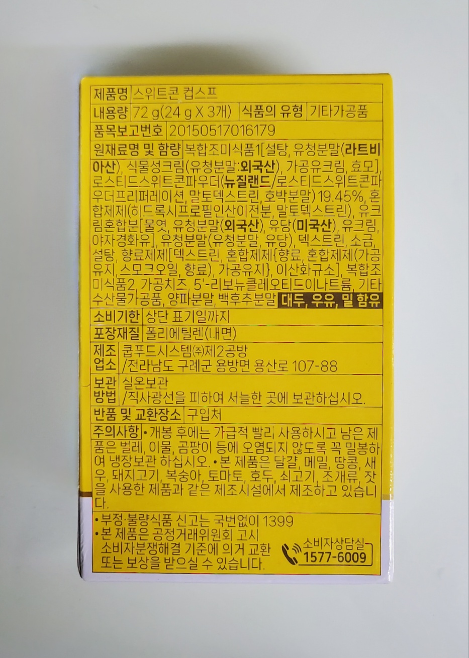 | | | 공급시기 | | 기획공급 | | | 식품유형 | | 기타가공품 | | | 생산지 | | 쿱푸드시스템㈜제2공방 / 전라남도 구례군 용방면 용산로 107-88 | | | 원부재료 | | 복합조미식품1[설탕, 유청분말(라트비아산), 식물성크림(유청분말:외국산), 가공유크림, 효모], 로스티드스위트콘파우더(뉴질랜드/로스티드스위트콘파우더프리퍼레이션, 말토덱스트린, 호박분말)19.45%, 혼합제제(히드록시프로필인산이전분, 말토덱스트린), 유크림혼합분[물엿, 유청분말(외국산), 유당(미국산), 유크림, 야자경화유], 유청분말(유청분말, 유당), 덱스트린, 소금, 설탕, 향료제제[덱스트린, 혼합제제{향료, 혼합제제(가공유지, 스모크오일, 향료), 가공유지}, 이산화규소], 복합조미식품2, 가공치즈, 5'-리보뉴클레오티드이나트륨, 기타수산물가공품, 양파분말, 백후추분말 [대두, 우유, 밀 함유] | | | 중량설명 | | 72g(24g*3개) | | | 포장재질 | | 폴리에틸렌(내면) | | | 소비기한 | | 제조일로부터 12개월 | | | 보관방법 | | 실온보관 / 직사광선 및 고온다습한 곳을 피해 서늘한 곳에 보관 하십시오. | | | 영양성분표시 | | 총 내용량72g(24gx3개) / 1개(24g)당 함량 열량 95kcal, 나트륨 320mg(16%), 탄수화물 18g(6%), 당류 8g(8%), 지방 1.5g(3%),트랜스지방 0g, 포화지방 1g(7%), 콜레스테롤 5mg미만(1%), 단백질 2g(4%) *()안의 1일 영양성분 기준치에 대한 비율(%)은 2,000kcal 기준이므로 개인의 필요 열량의 따라 다를 수 있습니다. | |