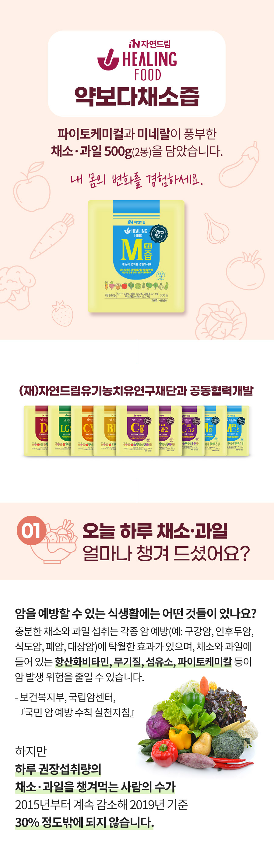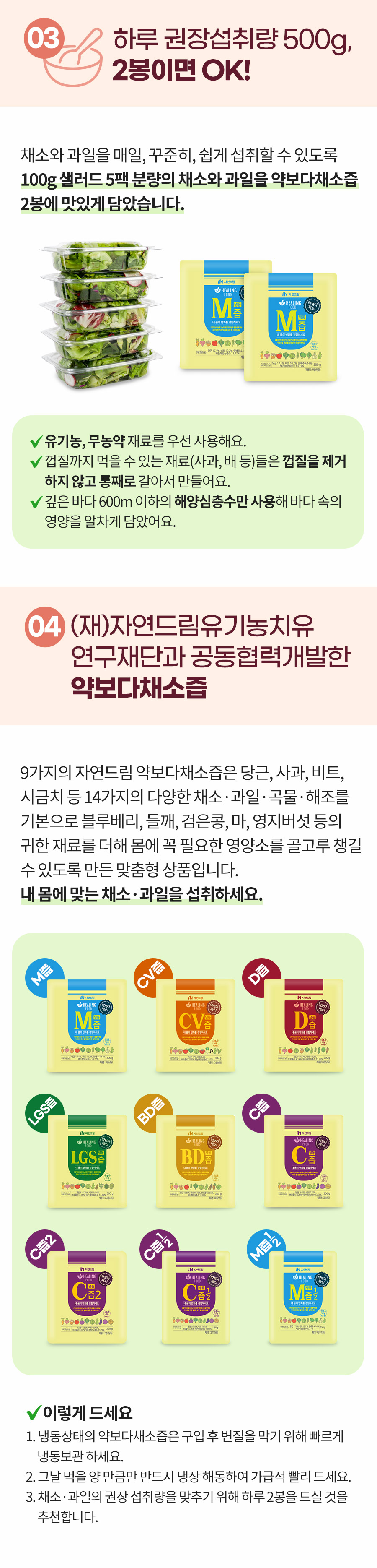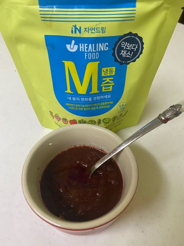 | | | 상품특징 | | ① 채소와 과일을 갈아 만들어 맛과 풍미가 살아있습니다. ② 뿌리채소 4종, 잎채소 8종, 과일과채 3종으로 미량영양소(비타민, 미네랄)와 식이섬유가 풍부합니다. ③ 미네랄이 풍부한 해양 심층수를 사용하였습니다. ④ (재)자연드림유기농치유연구재단과 공동협력 개발하였습니다. | | | 생산과정 | | ① 원재료 입고 후 꼼꼼히 검수 후 손질합니다. ② 생산량에 맞춰 정확한 원료 계량합니다. ③ 원재료를 세척하여 탈수를 합니다. ④ 어느 정도 물기가 제거된 원재료들을 믹서기에 넣고 믹싱합니다. ⑤ 포장 방법에 맞춰 포장을 합니다. ⑥ X-ray 검출기로 금속이물과 기타 이물 검출 실시 후 냉동보관하여 출고 합니다. | | | 이용방법 | | 꼭 냉장 해동하여 흔들어서 드세요 식사 시, 하루 1~2개 섭취해 주세요 상온에서 해동 시 품질의 변화가 있을 수 있으며 해동 후 재냉동시키지 마시길 바랍니다 | | | 기타사항 | | ① 이 제품은 알류, 우유, 메밀, 땅콩, 대두, 밀, 고등어, 게, 돼지고기, 복숭아, 토마토, 호두, 닭고기, 쇠고기, 오징어, 조개류, 잣을 사용한 제품과 같은 시설에서 제조하였습니다. ② 장시간 상온에 노출 시 변질 우려가 있으니 바로 드시기 바랍니다. | |