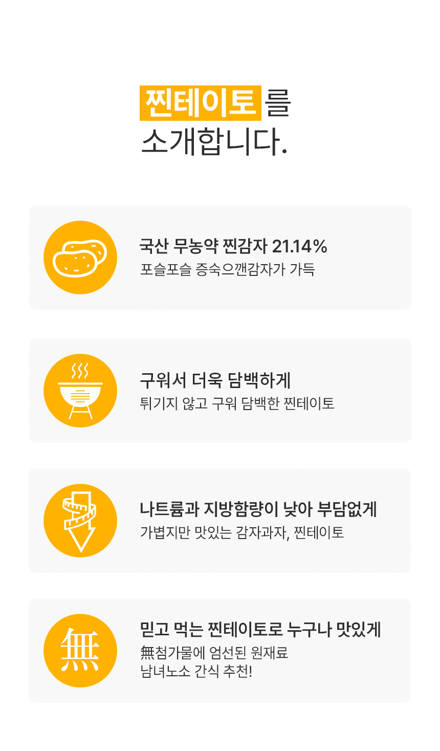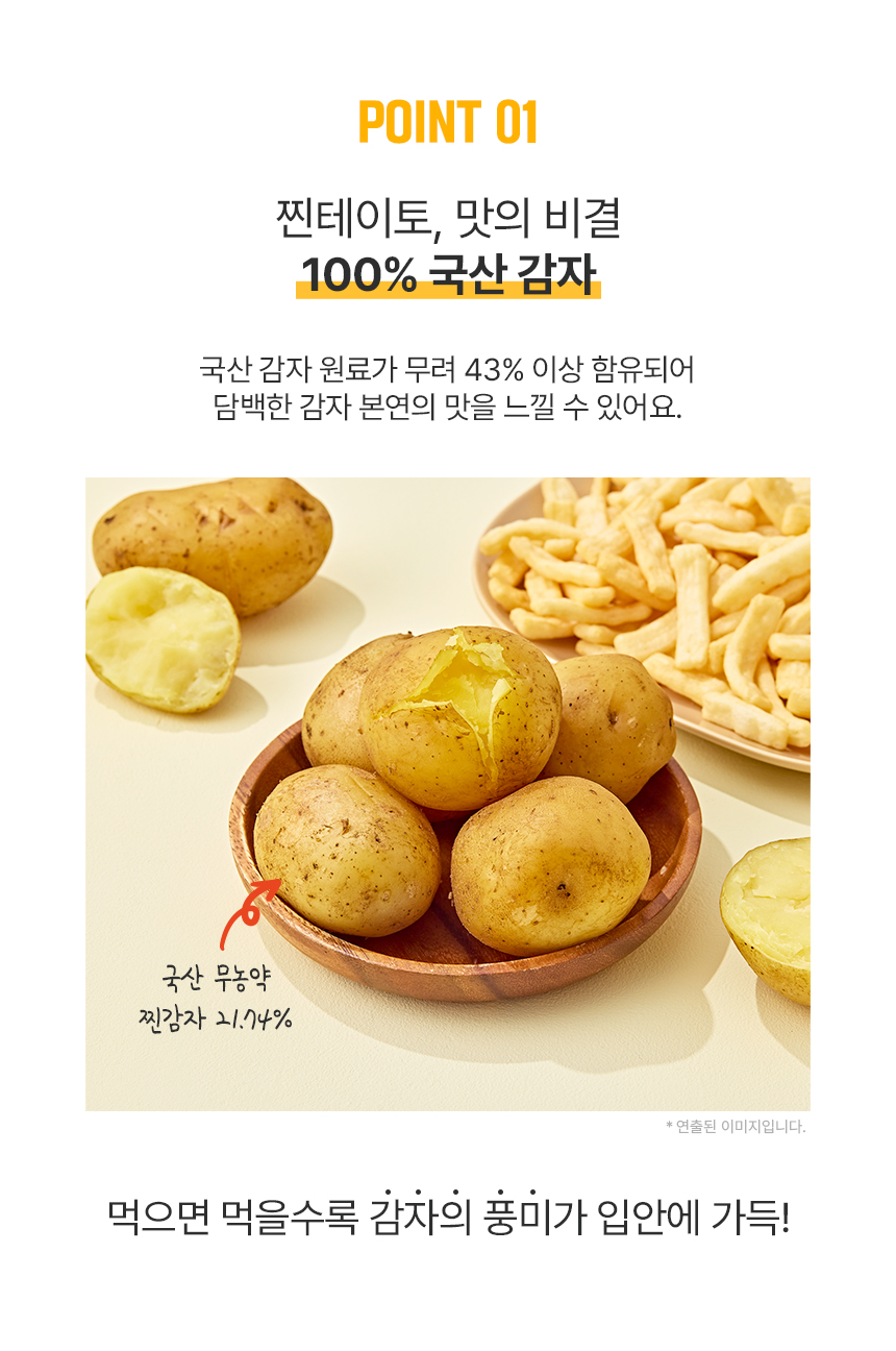 | | | 물품특징 | | 1. 무농약 생감자로 만든 건강한 스낵 - 무농약 생강자를 직접 갈아 만들어 감자 본연의 맛과 영양을 살렸습니다. 2. 기름에 튀기지 않아 깔끔한 맛 - 유탕 공정을 거치지 않아 느끼함 없이 담백하게 즐길 수 있습니다. 3. 믿을 수 있는 국내산 원료사용 - 주요 원료를 국내산으로 사용해 더욱 안심하고 드실 수 있습니다. 4. 불필요한 첨가물은 제외 - 팽창제, 합성보존료, MSG를 넣지 않아 더욱 순하고 부담 없는 스낵입니다. | | | 생산과정 | | | | | 이용방법 | | | | | 기타사항 | | | |