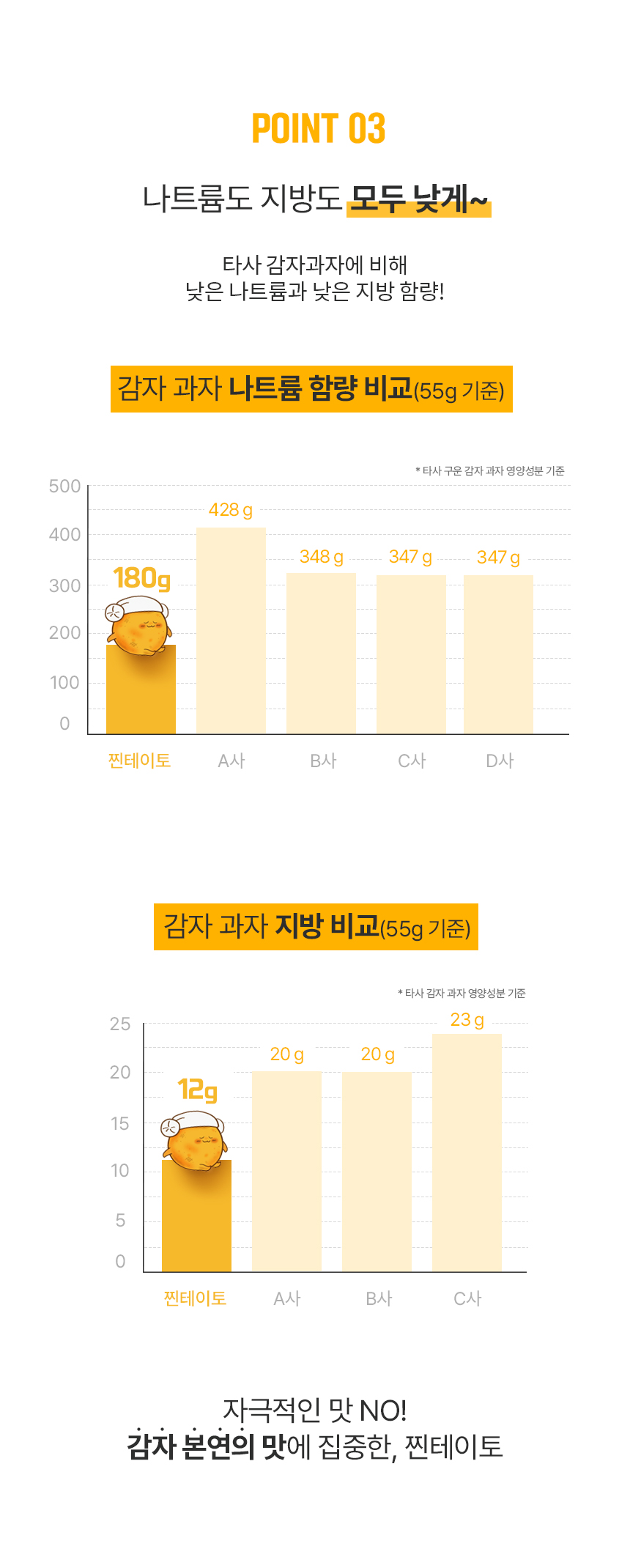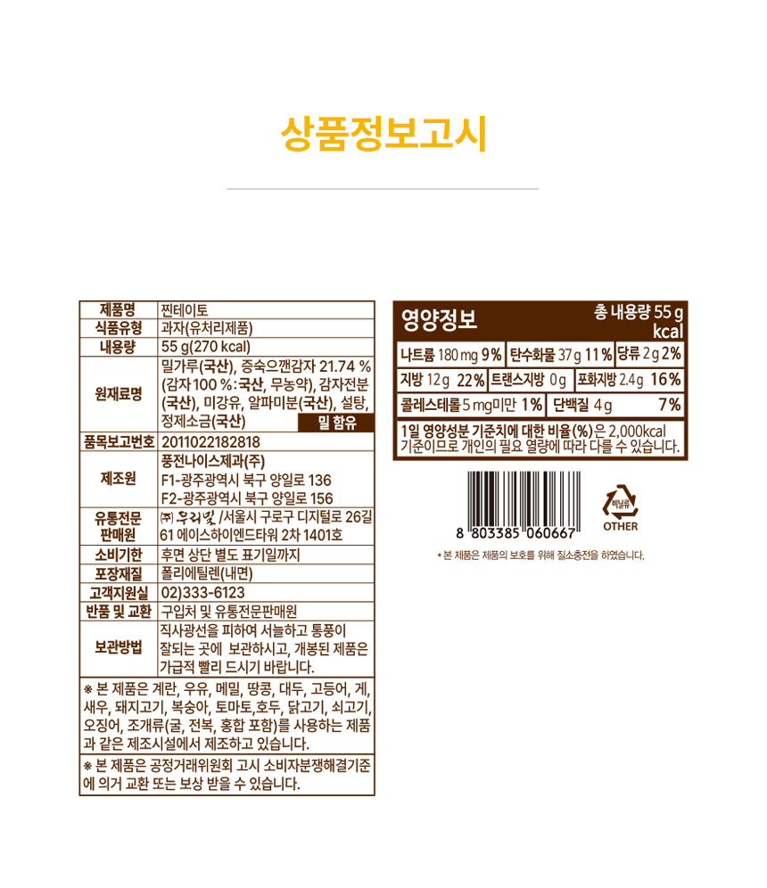 | | | 공급시기 | | 기획공급 | | | 식품유형 | | 과자 | | | 생산지 | | 풍전나이스제과(주) F1-광주광역시 북구 양일로 136 F2-광주광역시 북구 양일로 156 | | | 원부재료 | | 밀가루(국산),증숙으깬감자21.74%(감자100%:국산,무농약),감자전분(국산),미강유,알파미분(국산),설탕,정제소금(국산) | | | 중량설명 | | 55g | | | 포장재질 | | 폴리에틸렌(내면) | | | 소비기한 | | 후면 상단 별도 표기일까지 | | | 보관방법 | | 직사광선을 피하여 서늘하고 통풍이 잘되는 곳에 보관하시고, 개봉된 제품은 가급적 빨리 드시기 바랍니ㅏ. | | | 영양성분표시 | | 총 내용량 55g (270kcal) 나트륨 180mg 9% 탄수화물 37g 11% 당류 2g 2% 지방 12g 22% 트랜스지방 0g 포화지방 2.4g 16% 콜레스테롤 5mg미만 1% 단백질 4g 7% 1일 영양성분 기준치에 대한 비율(%)은 2,000kcal 기준이므로, 개인의 필요 열량에 따라 다를 수 있습니다. | |