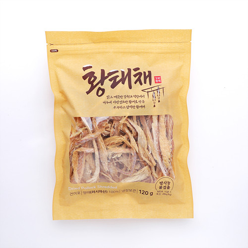[황태채 무침] * 재료 : 황태채 적당량, 들기름 2 큰 술, 고춧가루 1 큰 술, 고추장 3 큰 술, 다진 마늘 약간, 올리고당 3 큰 술, 간장 1/2 큰 술 ① 황태채는 적당한 크기로 자른 후 가늘게 찢어서 준비합니다. ② 황태채에 들기름을 넣어 잘 버무려 줍니다. ③ 고춧가루, 고추장, 다진 마늘, 올리고당, 간장을 잘 저어서 물을 살짝 넣어 끓여줍니다. ④ 준비해둔 황태채에 양념장을 넣고 잘 버무려 준 뒤 통깨를 뿌려 완성합니다. | | | 기타사항 | | - 제품 특성상 간혹 선별 과정에서 제거되지 않은 황태 뼈나 가시가 있을 수 있으니, 섭취 시 주의해 주시기 바랍니다. - 본 제품은 자연건조 방식으로 제조된 제품으로, 보관 환경에 따라 벌레가 발생할 수 있습니다. 이 경우 구입처 또는 소비자상담실로 연락 주시면 즉시 교환해 드리겠습니다. - 이 제품은 조개류(바지락, 굴, 홍합, 키조개, 대합조개), 새우, 오징어를 사용한 제품과 같은 제조시설에서 제조하고 있습니다. | |