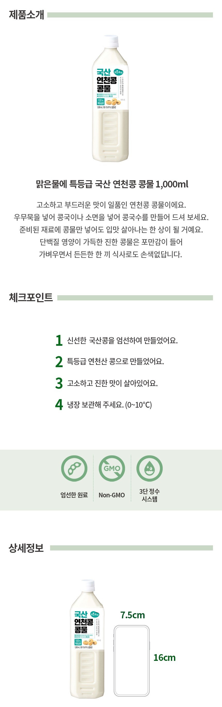| | 물품특징 | | 1. 특등급 연천콩만 하용하여 고소한 맛이 살아있는 콩물 2. 유화제, 증점제, 설탕 무첨가로 건강한 콩물 3. 씨눈까지 통째로 갈아낸 콩물로 영양손실을 최소화하고 정제소금으로 간이 되어있는 부드러운 콩물 | | 이용방법 | | < 국산 콩물 다양하게 즐기기>