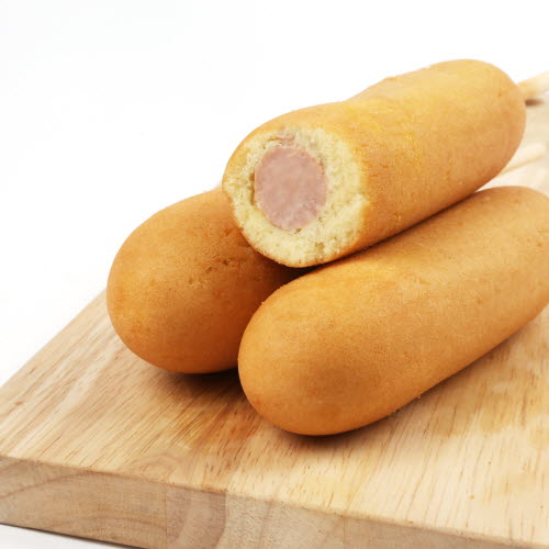 생산과정소시지 스틱꽂이 → 원재료 계량 → 발효액 숙성 → 발효액 + 반죽 혼합 → 반죽 발효 → 성형(반죽입히기) → 유탕 → 냉각 후 낱개 포장 → 3개입 벌크 포장
