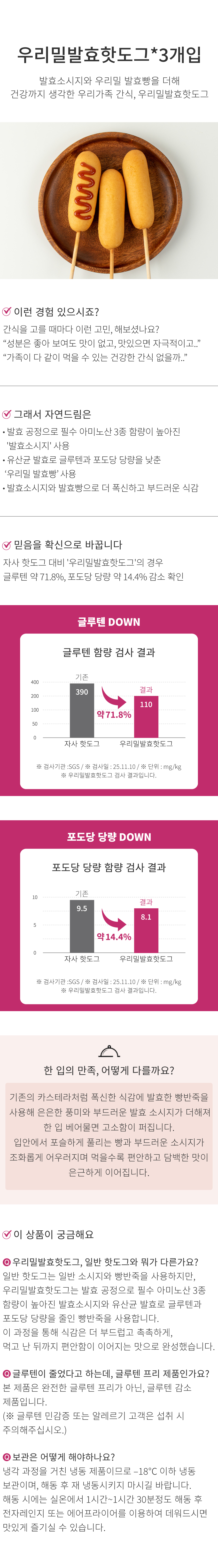 | | | | 생산과정 | | 소시지 스틱꽂이 → 원재료 계량 → 발효액 숙성 → 발효액 + 반죽 혼합 → 반죽 발효 → 성형(반죽입히기) → 유탕 → 냉각 후 낱개 포장 → 3개입 벌크 포장 | | | 조리방법 | | 해동상태와 조리기계에 따라 조리시간은 변동될 수 있습니다. 1. 전자레인지 조리 시(조리시간/1100W 기준) - 자연해동(실온에서 1시간~1시간 30분정도 해동)시킨 핫도그를 전자레인지에 넣고 1개일 때 약 30초, 2개일 때 약 50초, 3개일 때 약 1분 10초 조리해 주세요. (전자레인지 기종에 따라 조리시간에 차이가 날 수 있으며, 해당 시간으로 조리하여도 상품이 차가울 경우 1개일때 약 10초, 2개 또는 3개일 때 약 20초간 더 조리하여 주십시오.) 2. 에어프라이어 조리 시 - 160℃로 예열된 에어프라이어에 냉동 상태의 핫도그 1개를 넣은 후 약 15분 가량 조리해 주시면 갓 튀겨냈을 때처럼 바삭하고 쫄깃한 핫도그를 드실 수 있습니다. 에어프라이어 기종 및 화력에 따라조리시간이 차이날 수 있습니다. 표시된 시간대로 조리하여도 제품이 차가울 경우 약 1분간 더 조리하여 주십시오.