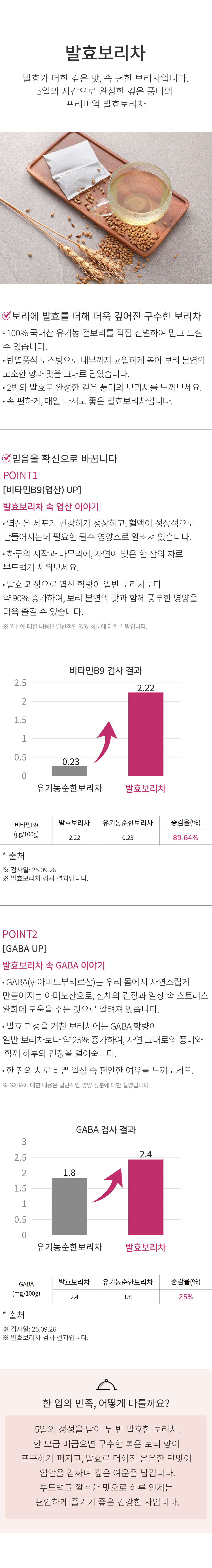 | | 상품특징 | | 따뜻한 물이나, 차가운 물에 티백을 우려서 간단하게 마실 수 있습니다. | | 이용방법 | | ① 따뜻한 보리차 : 끓인 물(따뜻한 물) 1L에 티백 한 개를 넣고 5분 정도 우려내어 드세요. ② 시원한 보리차 : 생수 또는 찬 물 1L에 티백 한 개를 넣고 20~30분 정도 우려내어 드세요. ③ 기호에 따라 물량이나 티백수량을 조절해서 드세요. | | 생산과정 | | 보리입고 -> 1차선별->발효 -> 로스팅 -> 냉각 -> 선별 -> 분쇄 -> 선별(분진거름) ->2차발효->육안선별-> 포장 | | 주의사항 | | ① 티백을 오래 담가놓거나 주전자에 넣고 끓이면 침전물이 생길 수 있으나 섭취하셔도 무방합니다. ② 물이 식으면 냉장고에 넣어 보관하시고 가능한 한 빨리 드세요. | |