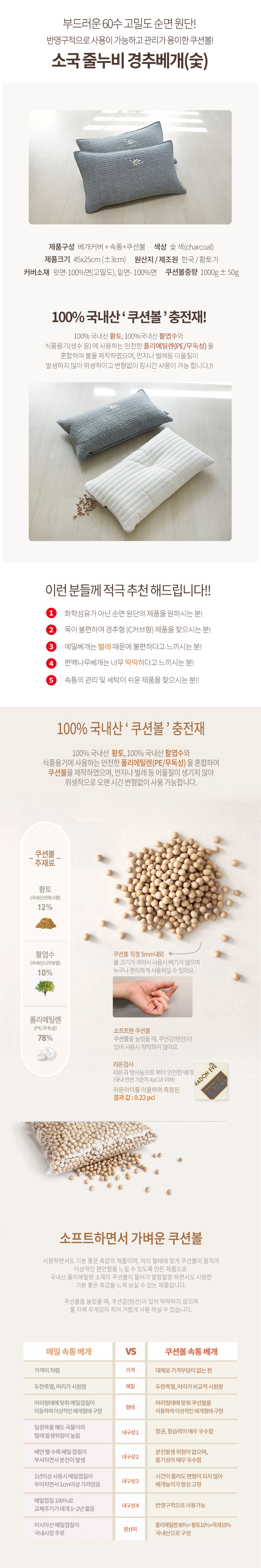 NO! 화학물질걱정  숯소국줄누비경추베개   |    형광증백제, 아릴아민, 포름알데히드 없는 상품입니다.