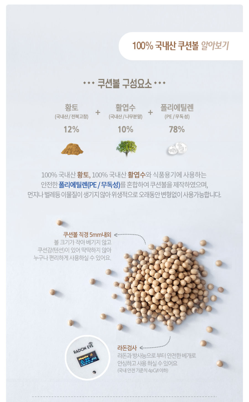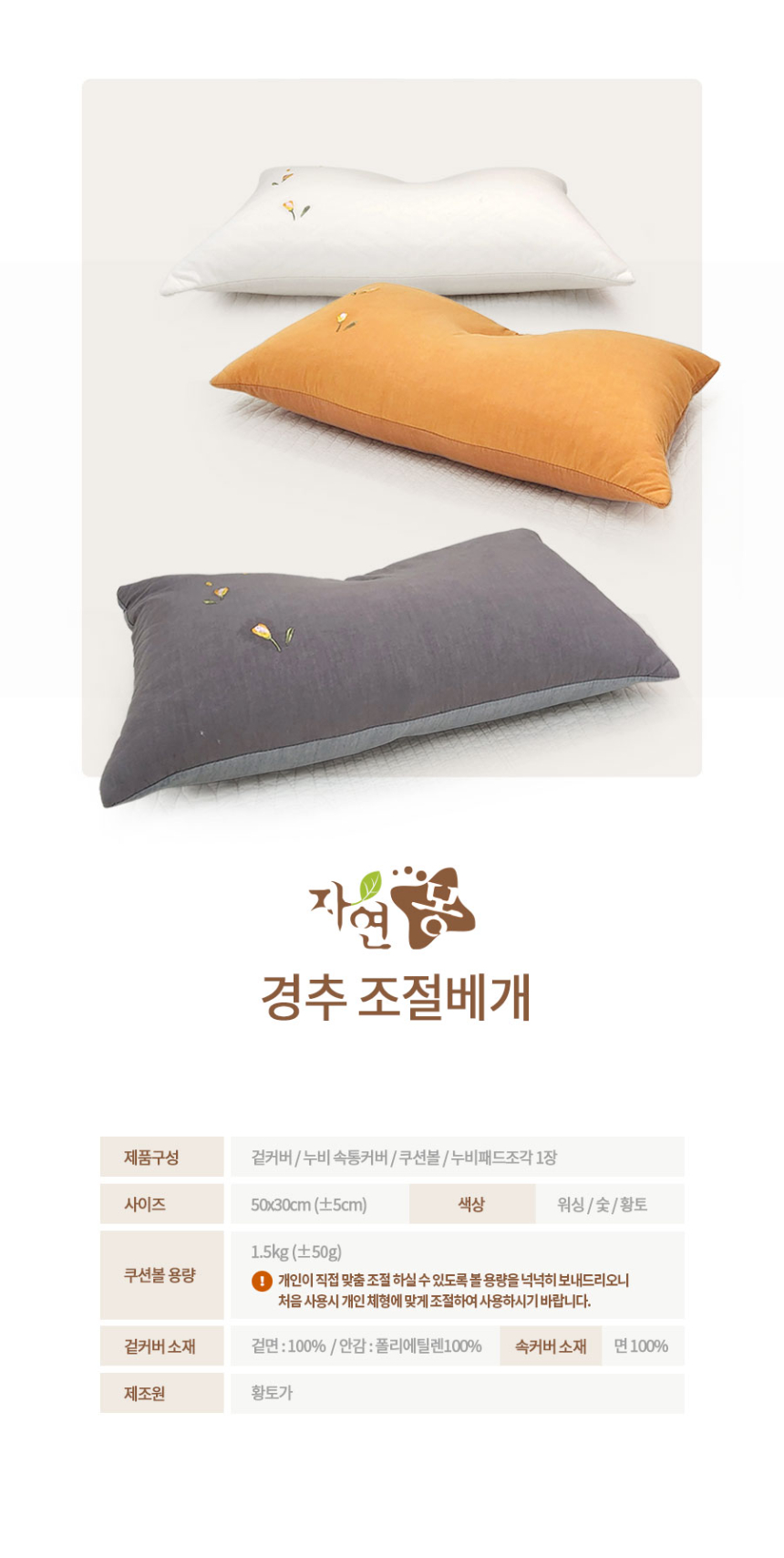 | 상품 소재 (섬유의 조성 또는 혼용률을 백분율로 표시, 충전재를 사용한 상품은 충전재를 함께 표기) | 상세정보 참고 | | 색상 | 숯색 | | 치수 | 상세정보 참고 | | 상품구성 | 황토볼경추조절베개(숯) | | 제조자, 수입품의 경우 수입자를 함께 표기 (병행수입의 경우 병행수입 여부로 대체 가능) | 황토가 (경남 양산시) | | 제조국 | 한국 | | 세탁방법 및 취급시 주의사항 | 상세정보 참고 | | 품질보증기준 | 관련 법 및 소비자분쟁해결 기준에 따름 | | A/S 책임자와 전화번호 | 상담팀 1577-6009 |