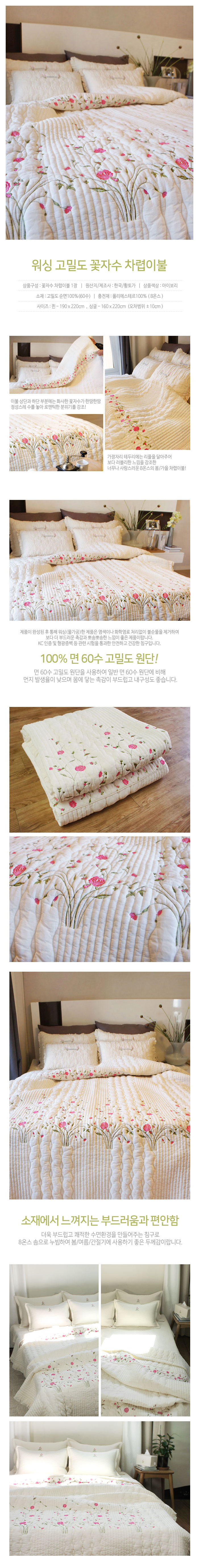 | 상품 소재 (섬유의 조성 또는 혼용률을 백분율로 표시, 충전재를 사용한 상품은 충전재를 함께 표기) | 상세정보 참고 | | 색상 | 아이보리 | | 치수 | 상세정보 참고 | | 상품구성 | 워싱고밀도꽃자수차렵이불*퀸 | | 제조자, 수입품의 경우 수입자를 함께 표기 (병행수입의 경우 병행수입 여부로 대체 가능) | 황토가 | | 제조국 | 한국 | | 세탁방법 및 취급시 주의사항 | 상세정보 참고 | | 품질보증기준 | 관련 법 및 소비자분쟁해결 기준에 따름 | | A/S 책임자와 전화번호 | 상담팀 1577-6009 |
