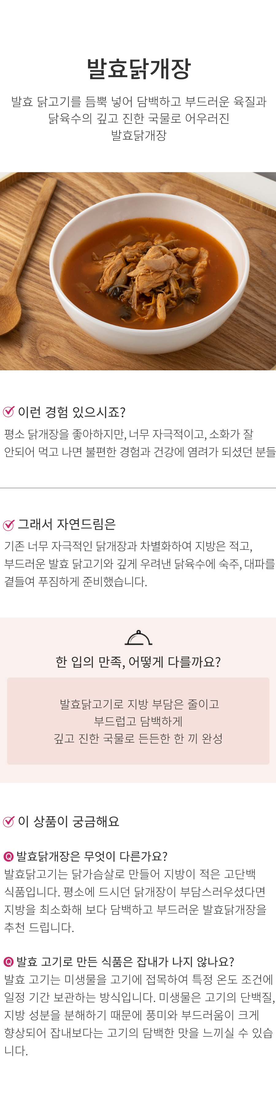 | | | 물품특징 | | * 괴산 자연드림파크 1단지 프라이드리탕공에서 직접생산하는 상품입니다. * 자연드림 깊은바다소금을 사용하였습니다. * 집에서 간편하게 데워 먹을 수 있습니다. | | | 이용방법 | | * 냉장보관하시고 개봉 후에는 변질 우려가 있으니 가능한 한 빨리 드십시오. * 본 제품은 충분히 가열하여 드시기 바랍니다. * 전자렌지에 넣거나 과도한 압력을 가하지 마세요. (전자레인지 사용시, 전용 용기에 부어서 데워드십시요.) * 냄비나 뚝배기에 내용물을 부어 데워 드십시요. * 터질 우려가 있으니, 끓는 물에 봉지째 넣거나 봉지 그대로 조리하시지 마시고 조리방법을 준수 하십시요. *기호에 따라 파,소금,후추등을 넣어 드시면 더욱 좋습니다.