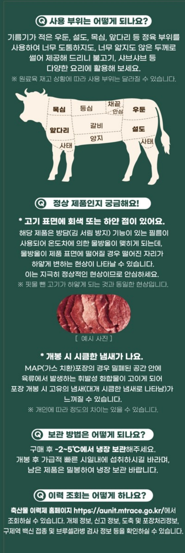 우둔, 설도, 앞다리, 목심 등 정육 부위를 얇게 썰어 만든 제품으로