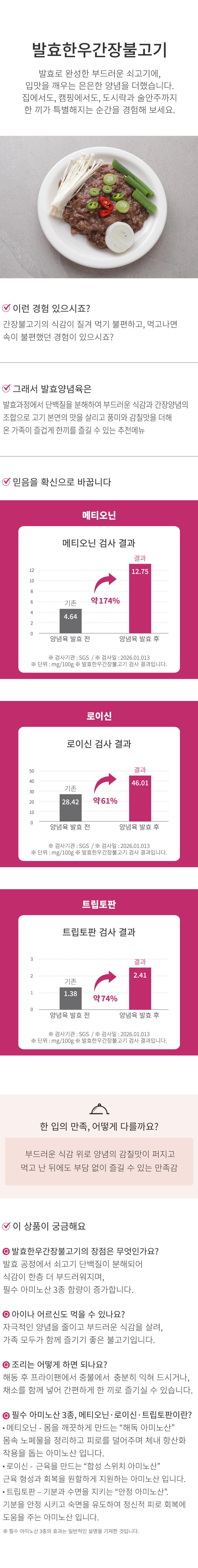 | | | 상품특징 | | 1. 발효과정으로 부드러운 식감 먹고 난 뒤에도 부담 없이 즐길 수 있는 만족감. 2. 필수 아미노산 3종 함량이 증가 하였습니다. | | | 생산과정 | | 원/부재료입고 → 해동 → 원료육/양념배합 → 발효 → 내포장 → 금속검출기 → 외포장 → 보관/출고 (-18℃ 이하) | | | 이용방법 | | 본 제품은 비가열 제품 이므로 반드시 조리 후 익혀서 드시기 바랍니다. 1. 해동 후 각종 야채와 함께 프라이팬에 넣어 중불에서 골고루 익혀 드세요. 2. 해동된 제품은 발효가 지속되오니 즉시 조리하여 섭취하시기 바랍니다 | | | 기타사항 | | 1. 본 제품은 비살균 제품이므로 충분히 가열 후 섭취 하여 주시기 바랍니다. 2. 원료육 특성상 뼈 및 연골이 혼입될 수 있으니 섭취 시 주의 바랍니다. 3. 조리시 화상을 입을 수 있으니 주의 하시기 바랍니다. 4. 이 제품은 쇠고기, 돼지고기, 닭고기, 우유, 달걀, 메밀, 땅콩, 고등어, 게, 새우, 복숭아, 토마토, 호두, 오징어, 조개류(굴, 홍합, 전복 포함), 잣을 사용한 제품과 같은 제조시설에서 제조하고있습니다. | |