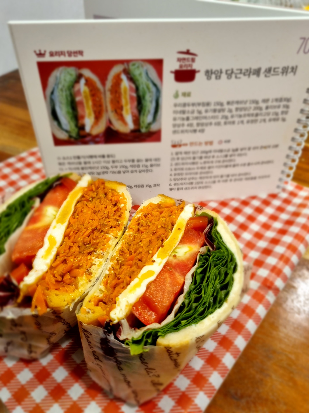 4. 노릇하게 구운 샌드위치식빵 2장에 [식빵소스]를 펴 바르고, 준비된 재료들을 차곡차곡 쌓아 올려 샌드위치를 완성한다.