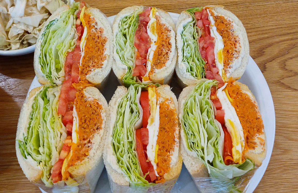 샌드위치식빵 4장, 항암당근 200g, 양상추 4장, 상추 6장, 토마토(대) 1개, 유정란 2개, 유채유 적당량, 소금 적당량, 식빵소스(볶은캐슈넛 150g, 부침용두부 150g, 레몬즙 2큰술, 올리브유 3큰술, 소금 1작은술, 설탕 1작은술), 당근라페소스(홀그레인머스타드 1큰술, 올리브유 5큰술, 레몬즙 2큰술, 올리고당 2큰술)