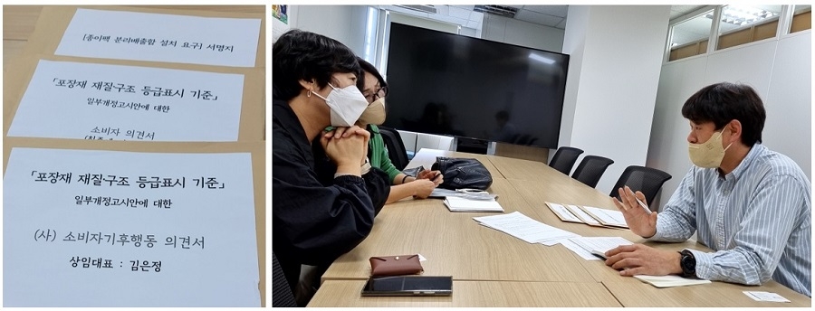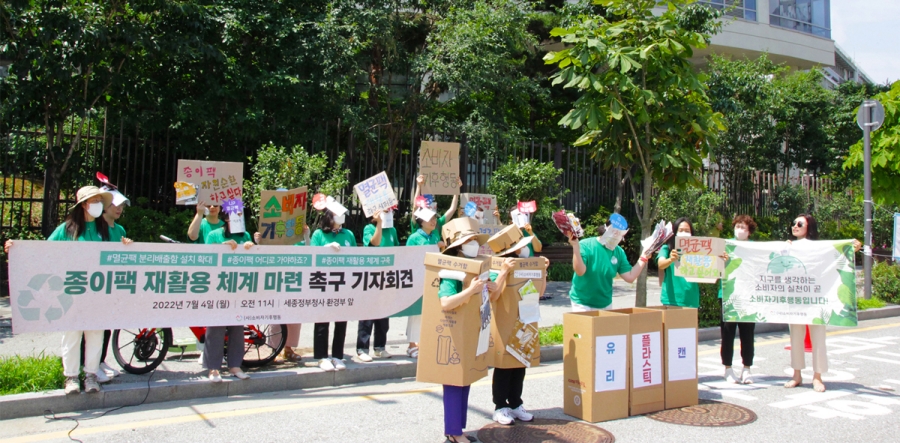 폐기물에서 재활용으로 — 멸균팩 구출작전2021년 2월, 소비자기후행동은 '폐기물에서 재활용으로, 멸균팩 구출작전' 캠페인을 시작했습니다. 전국 101개 아이쿱자연드림 회원조합과 함께 환경부 개정안에 반대 의견서를 제출하고, 행정법원에 고시 무효소송을 제기했으며, 멸균팩의 플라스틱 대체 효과에 대한 연구를 발표했습니다. 요구는 단순하고 명확했습니다. 1. 멸균팩에 분리배출 가능 표시를 하자. 2. 종이팩 전용 수거함(문앞 배출)을 설치하자. 3. 국가 차원의 종이팩 순환 시스템을 정비하고 지원하자. 환경부와의 간담회, 국회 토론회, 지역 캠페인, 현장 시범운영까지. 말로만 요구하지 않았습니다. 직접 수거하고, 직접 시범운영하고, 직접 증명했습니다.