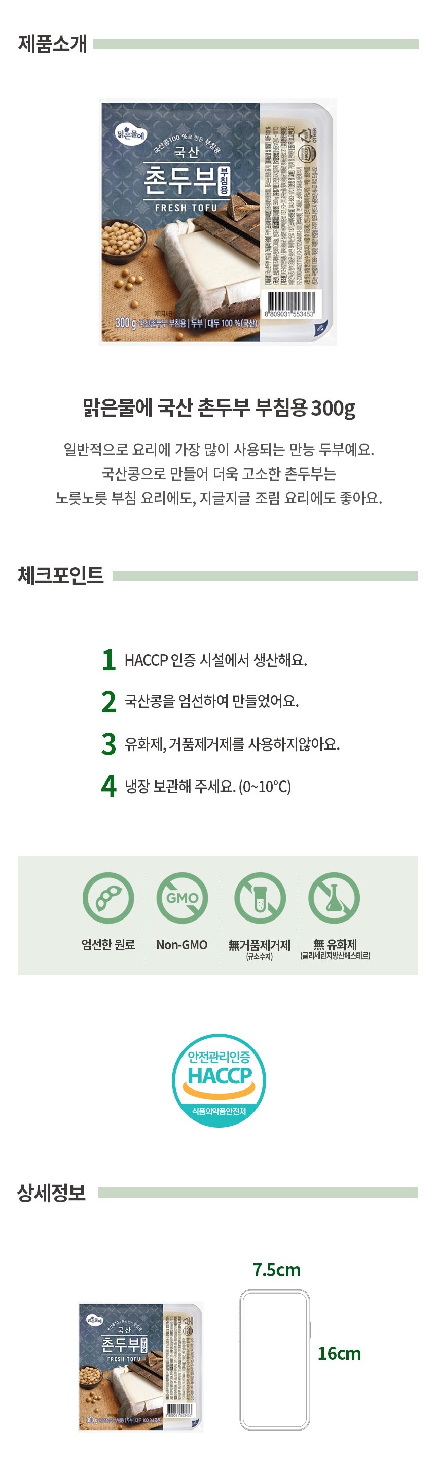 | 집밥의 따뜻함을 담아, 국산콩 부침용 두부로 정성 가득한 한 끼를 준비하세요. 겉은 노릇, 속은 부드럽고 고소한 맛. 가족과 함께 나누는 건강한 두부부침입니다. | ||