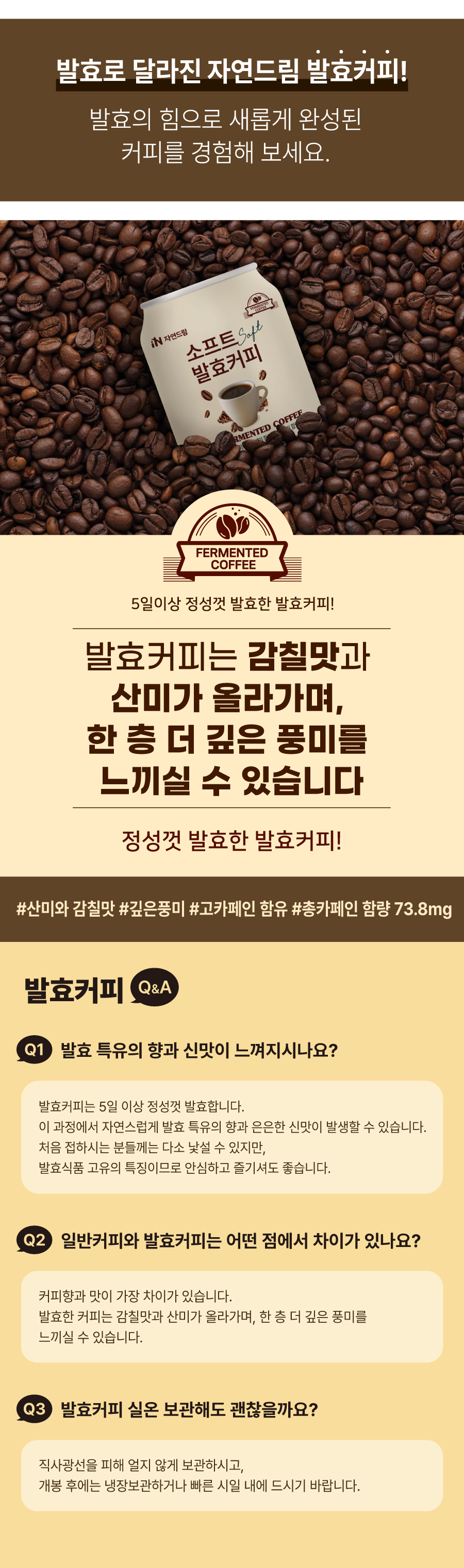 6. 소프트SOFT발효커피 총 내용량 238ml*2개입 (1개(238ml) 당 10kcal) 나트륨 0mg 0%, 탄수화물 3g 1%, 당류 1g 1%, 지방 0g 0%, 트렌스지방 0g, 포화지방 0g 0%, 콜레스테롤 0mg 0%, 단백질 0g 0% *1일 영양성분 기준치에 대한 비율(%)은 2,000kcal기준이므로 개인의 필요 열량에 따라 다를 수 있습니다. | |