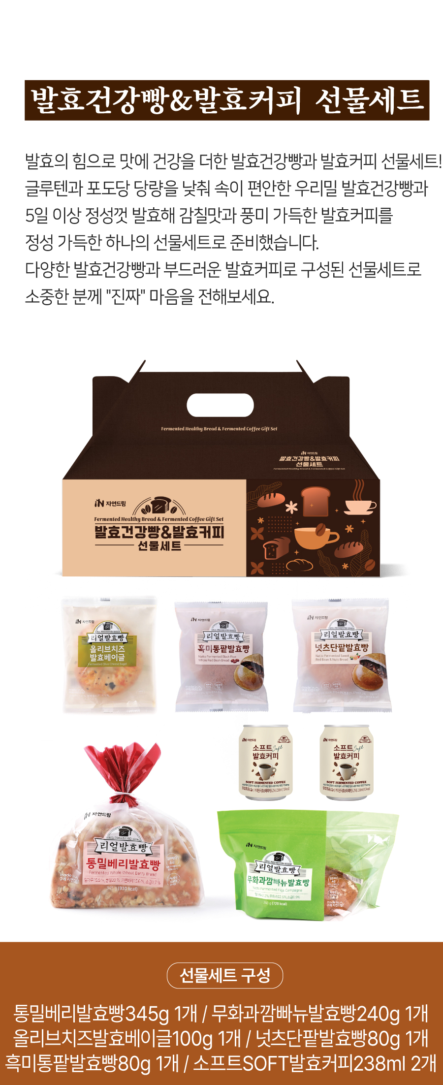 6. 소프트SOFT발효커피 정제수,소프트(SOFT)발효커피[커피(르완다),곡류가공품(쌀/국산),조제종국],천연향료(커피향),혼합제제(향료,프로필렌글리콜,곡물주정) | | 중량설명 | | 845.48 g (통밀베리발효빵 345g*1개, 무화과깜빠뉴발효빵 240g*1개, 올리브치즈발효베이글 100g*1개, 넛츠단팥발효빵 80g*1개, 흑미통팥발효빵 80g*1개, 소프트발효커피*캔 238ml*2개) | | 포장재질 | | 1. 통밀베리발효빵,무화과깜빠뉴발효빵,올리브치즈발효빵,넛츠단팥발효빵,흑미통팥발효빵 : 폴리프로필렌 2. 소프트SOFT발효커피 : 알미늄 캔 / 질소충전 | | 소비기한 | | * 별도 표기일까지
