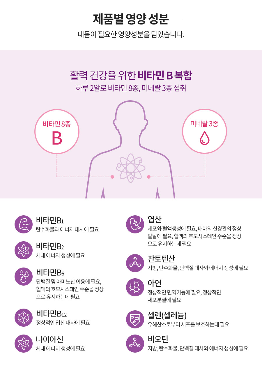 | 식품의 유형 | 건강기능식품/비타민B복합 아연, 셀렌, 크롬 | | 생산자 및 소재지, 수입품의 경우 수입자를 함께 표기 | (주)다움 / 경남 사천시 송포공단길 81-10 | | 제조연월일, 소비기한 또는 품질유지기한 | 제조일로부터 24개월 상품 발송일을 기준으로 소비기한의 1/3 이상 남은 상품만을 판매 | | 포장단위별 용량(중량), 수량 | 30 g(500 mg x 60정) / 30일분 | | 원재료명 및 함량(농수산물의 원산지 표시에 관한 법률에 따른 원산지 표시 포함) | 건조효모(비타민B1, 비타민B2, 비타민B6, 비오틴, 엽산, 나이아신, 판토텐산, 셀렌, 크롬, 아연/에스토니아산), 건조효모(비타민B12/미국산), 귀리식이섬유(독일산), 건조효모, 이눌린/치커리추출물, 프락토올리고당분말, 동결건조채소곡물과일혼합분말(찹쌀현미, 보리, 밀, 쌀, 미강, 백태:대두, 우엉, 연근, 당근, 감자, 고구마, 호박, 무, 야콘, 보리순, 케일, 신선초, 브로콜리, 양배추, 매실, 딸기/국산) 밀, 대두 함유 | | 영양정보 | 1일 섭취량 : 2정(1,000 mg) 1일 섭취량당 함량 : 열량 5 kcal, 탄수화물 1 g미만(0%), 단백질 1 g미만(1%), 지방 0 g(0%), 나트륨 0 mg(0%), 비타민B1 1.05 mg(88%), 비타민B2 1.12 mg(80%), 비타민B6 1.53 mg(102%), 비타민B12 2.4㎍(100%), 나이아신 11.2 mgNE(75%), 판토텐산 3.84 mg(77%), 엽산 595 ㎍DFE(149%), 비오틴 105 ㎍(350%), 아연 6.98 mg(82%), 셀레늄(또는 셀렌) 69.8 ㎍(127%), 크롬 69.8 ㎍(233%) *( )안의 수치는 1일 영양성분 기준치에 대한 비율 | | 기능정보 | 비타민B1 : 탄수화물과 에너지 대사에 필요 비타민B2 : 체내 에너지 생성에 필요 비타민B6 : 단백질 및 아미노산 이용에 필요, 혈액의 호모시스테인 수준을 정상으로 유지하는데 필요 비타민B12 : 정상적인 엽산 대사에 필요 나이아신 : 체내 에너지 생성에 필요 엽산 : 세포와 혈액생성에 필요, 태아의 신경관의 정상 발달에 필요, 혈액의 호모시스테인 수준을 정상으로 유지하는데 필요 판토텐산 : 지방, 탄수화물, 단백질 대사와 에너지 생성에 필요 아연 : 정상적인 면역기능에 필요, 정상적인 세포분열에 필요 셀레늄 : 유해산소로부터 세포를 보호하는데 필요 비오틴 : 지방, 탄수화물, 단백질 대사와 에너지 생성에 필요 크롬 : 체내 탄수화물, 지방, 단백질 대사에 관여 | | 섭취량, 섭취방법 및 섭취 시 주의사항 | 1일 1회, 1회 2정(1,000 mg)씩 물과 함께 섭취하십시오. 특정질환, 특이체질, 알레르기 체질, 임산부의 경우 간혹 개인에 따라 과민반응이 나타날 수 있으므로 원료를 확인하시고, 섭취 전에 전문가와 상담하시기 바랍니다. 어린이의 경우 목에 걸릴 우려가 있으니 보호자의 지도하에 섭취하십시오. 3세 이상 섭취가 가능합니다. (2세 이하 유아는 섭취하지 마십시오.) 당뇨병이 있는 경우 섭취 전 전문가와 상담 후 섭취하십시오. 이상사례 발생 시 섭취를 중단하고 전문가와 상담하십시오. | | 질병의 예방 및 치료를 위한 의약품이 아니라는 내용의 표현 | 본 제품은 질병의 예방 및 치료를 위한 의약품이 아닙니다. 건강기능식품은 인체에 유용한 기능성을 가진 원료나 성분을 사용하여 제조가공한 식품입니다. | | 유전자재조합식품에 해당하는 경우의 표시 | 해당사항 없음 | | 표시광고 사전심의필 | 본 광고물은 기능성 표시 · 광고 심의위원회의 심의를 받았습니다. | | 수입식품에 해당하는 경우 “건강기능식품에 관한 법률에 따른 수입신고를 필함”의 문구 | 해당사항 없음 | | 포장재질 | 용기-고밀도폴리에틸렌(HDPE)/뚜껑-폴리프로필렌(PP)/완충비닐-폴리에틸렌(PE) 종이박스(4.8×4.8×8.9 cm) | | 보관방법 및 취급방법 | 고온다습한 곳과 직사광선을 피하여 습기가 적고 건조한 곳에 보관하십시오. 개봉 후에는 뚜껑을 닫고 공기의 노출을 최대한 차단하여 보관하십시오. 영유아 및 어린이의 손에 닿지 않는 곳에 보관하십시오. | | 주의사항 | 섭취량 및 섭취방법을 준수하시고 기타 사항은 소비자 상담실로 문의하십시오. 본 제품은 식약처에서 고지한 알레르기 유발성분{알류(가금류), 우유, 메밀, 땅콩, 고등어, 게, 새우, 돼지고기, 복숭아, 토마토, 호두, 닭고기, 쇠고기, 오징어, 잣, 아황산류, 조개류(굴, 전복, 홍합 포함)}을 사용하는 동일한 제조시설(작업자, 기구, 제조라인, 원료보관 등 모든 과정)에서 생산되고 있습니다. 이상 사례 신고는 국번없이 1577-2488 | | A/S 책임자와 전화번호 | 상담팀 1577-6009 |