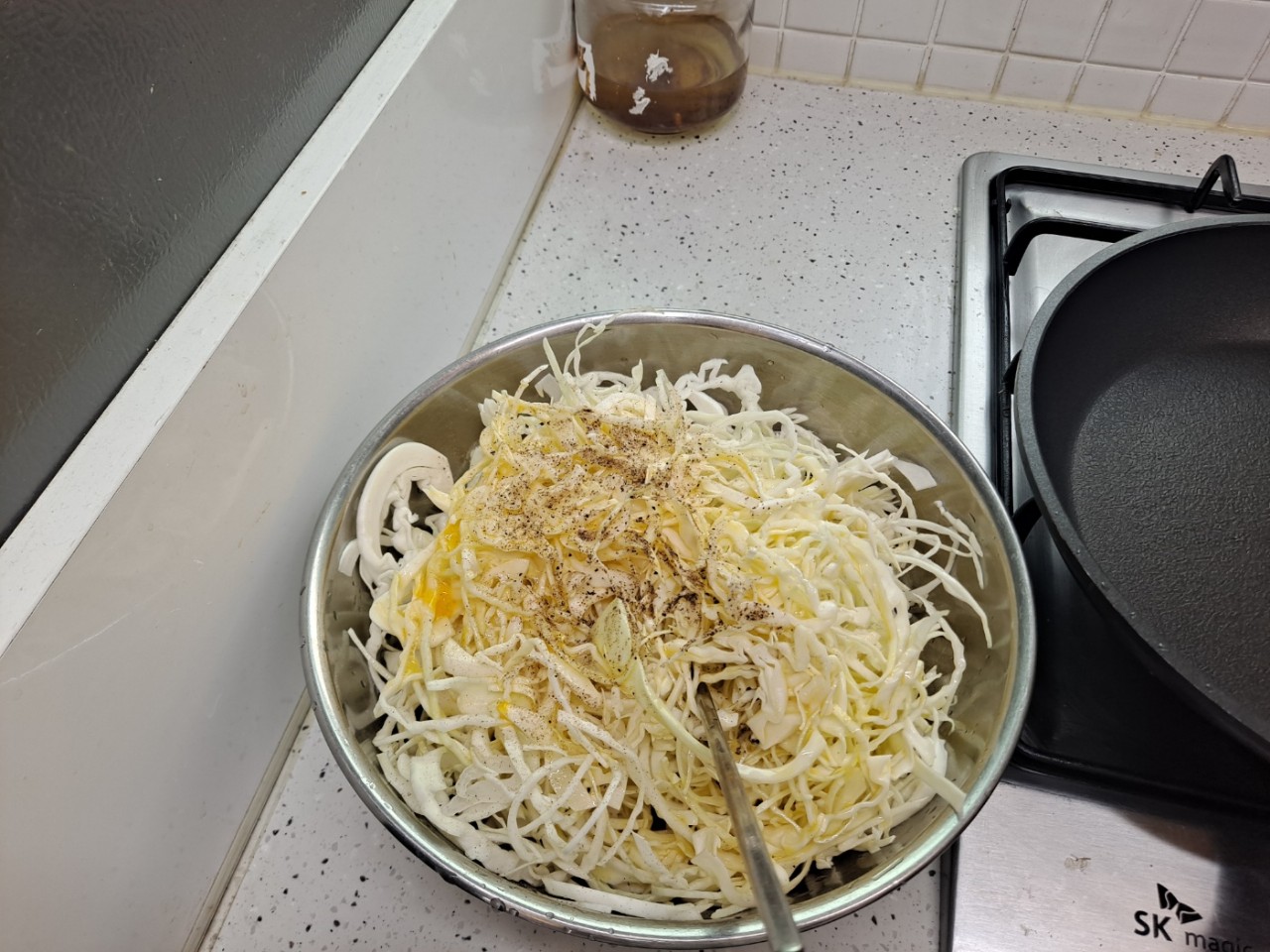 1) 양배추는 계란을 넣고 반죽하여 간합니다.